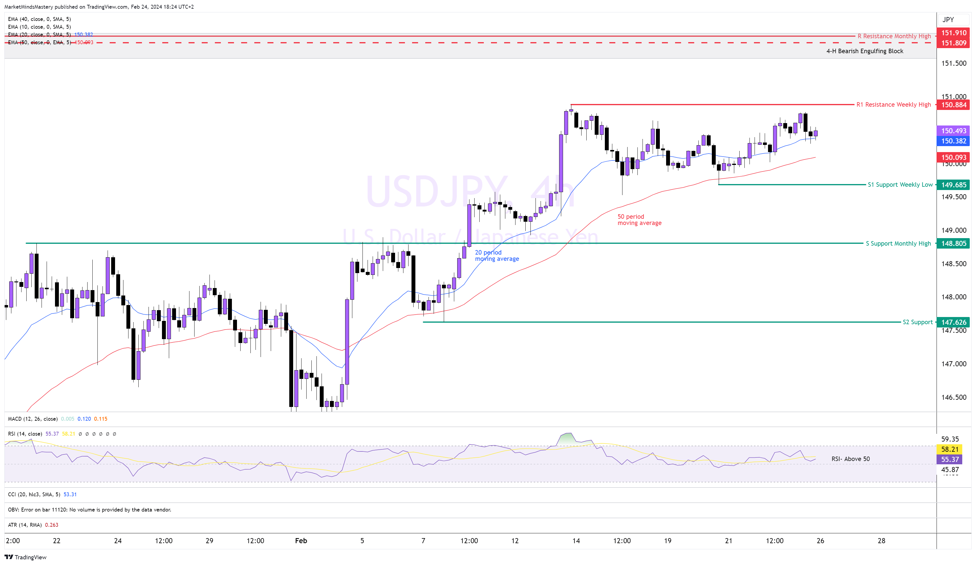 Im Gegenteil, wenn der Preis fällt und sich nach unten bewegt, kann der 50-Perioden gleitende Durchschnitt als dynamische Unterstützung dienen. Die erste statische Unterstützung ist jedoch der S1, der bei 149,685 liegt und ein Wochentief darstellt. Ein Unterschreiten dieser Marke kann den Kurs in den nächsten Unterstützungsbereich, S2, treiben, der vom Hoch des Vormonats ausgeht;