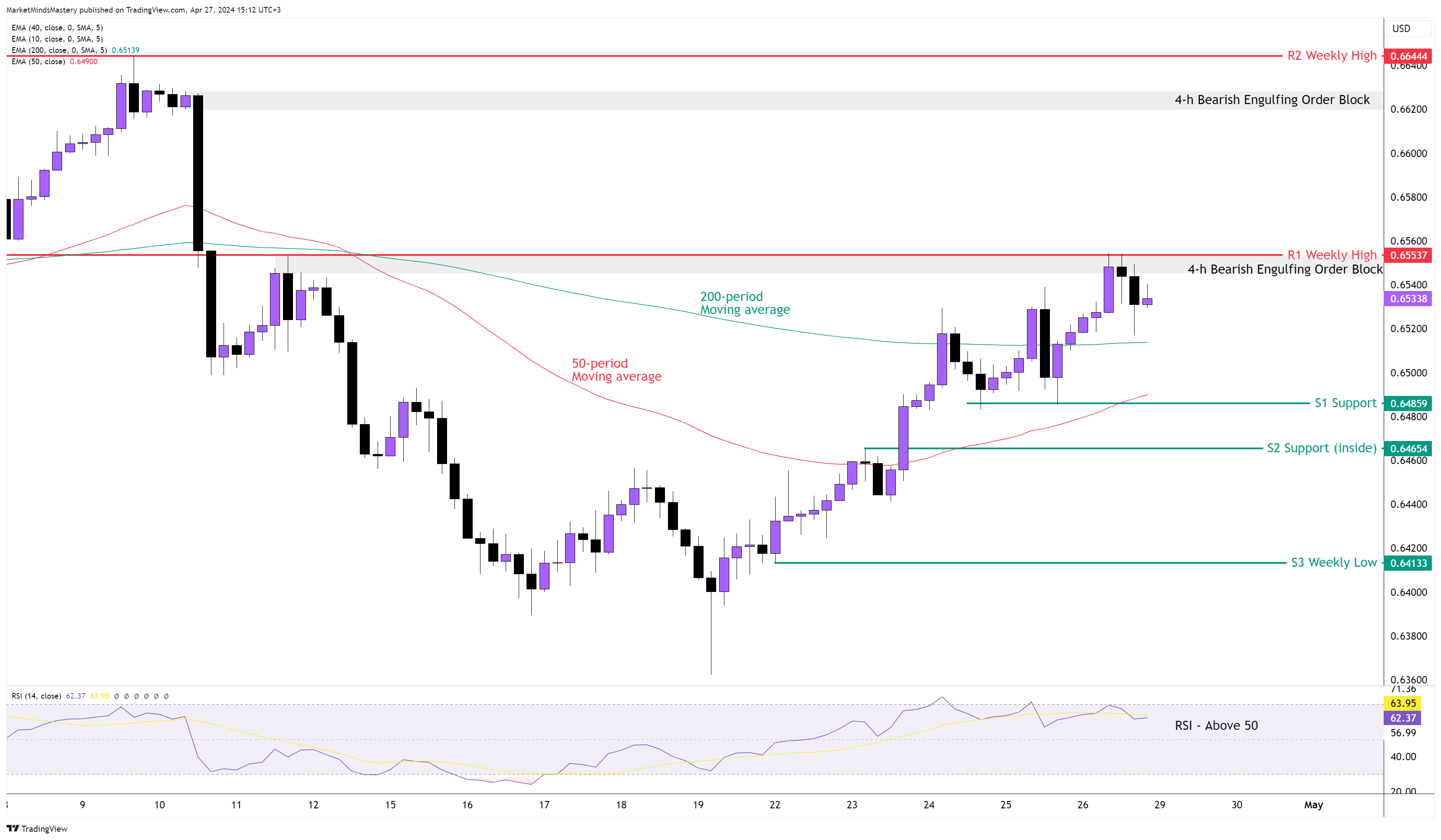 Por el contrario, si el precio continúa haciendo máximos y mínimos más altos, la primera resistencia, R1, será el máximo de la semana anterior, con el Bearish Engulfing Order Block de 4 horas en torno a 0,65537. Si el precio penetra el R1 y se mueve al alza, la siguiente zona de resistencia es aproximadamente 80 por encima de 0,66444.