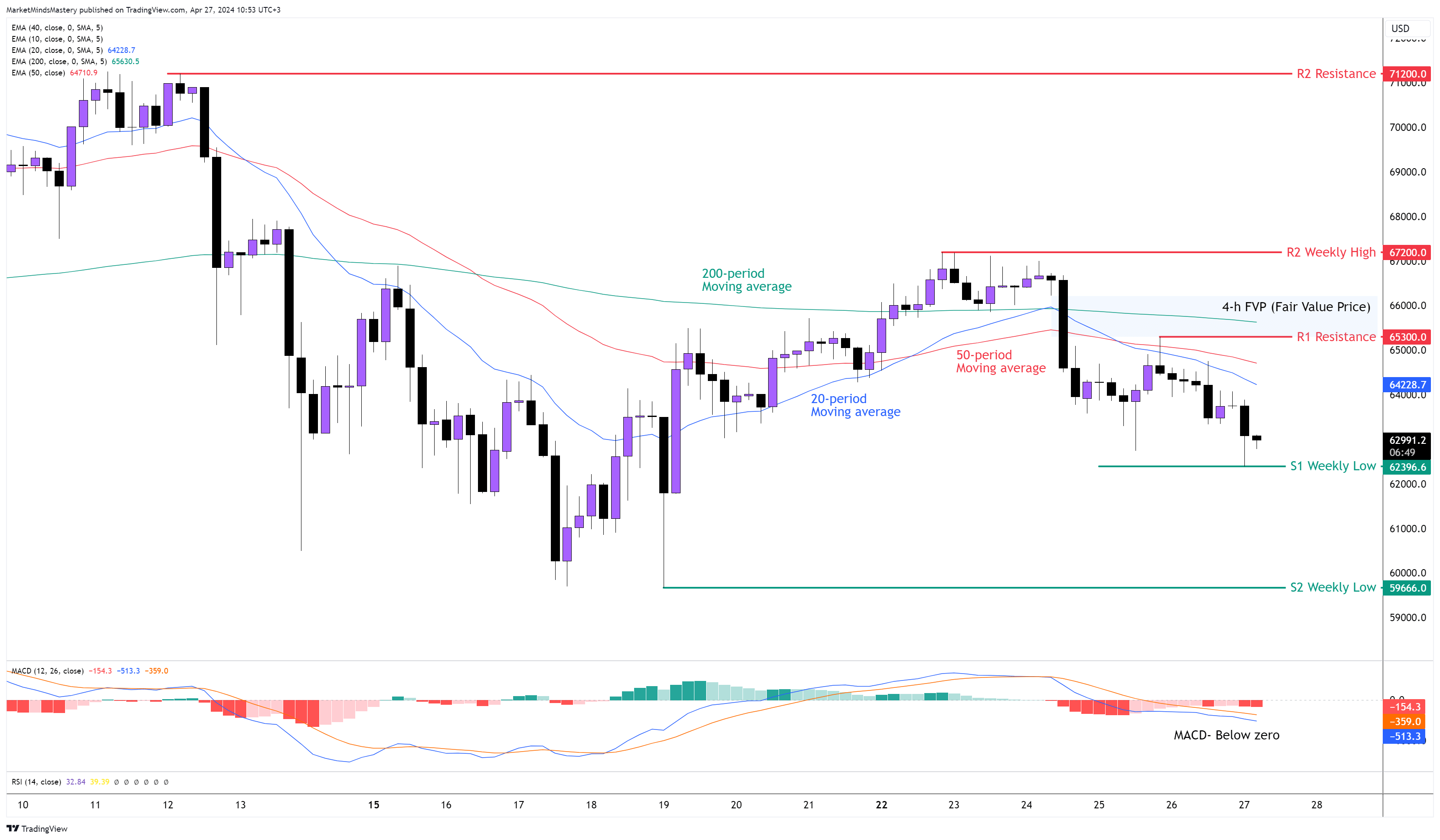Si el precio se mueve a la baja, la primera zona de soporte, S1, será el mínimo de la semana anterior, alrededor de 62396$. Si el precio penetra el S1, cierra por debajo y sigue moviéndose a la baja, la siguiente zona de soporte, S2, es otro mínimo semanal en torno a 59666 $. Por el contrario, si el precio encuentra soporte, rebota y se mueve al alza, la primera zona de resistencia, R1, se sitúa en 65300 $. Si el precio penetra el R1, cierra por encima y sigue subiendo, entra en una zona FVP. La siguiente zona de resistencia será el máximo de la semana anterior, R2, alrededor de $67200.