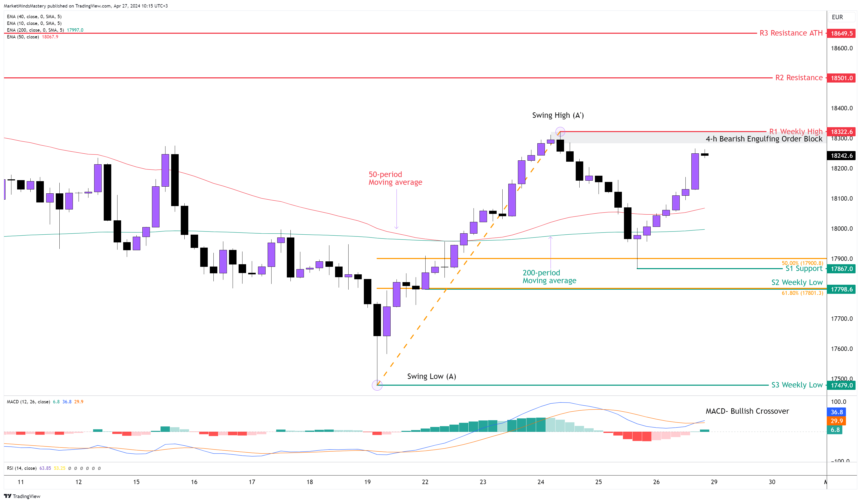 El precio se corrigió en el retroceso de Fibonacci del 50%, y se imprimió una Bullish Pin Bar, impulsando el precio al alza. Si el precio sube, la primera zona de resistencia, R1, estará alrededor de 18300. Hay un Bearish Engulfing Order Block en este nivel y un máximo de la semana anterior. Para que la tendencia alcista continúe, el precio debe romper por encima del R1.