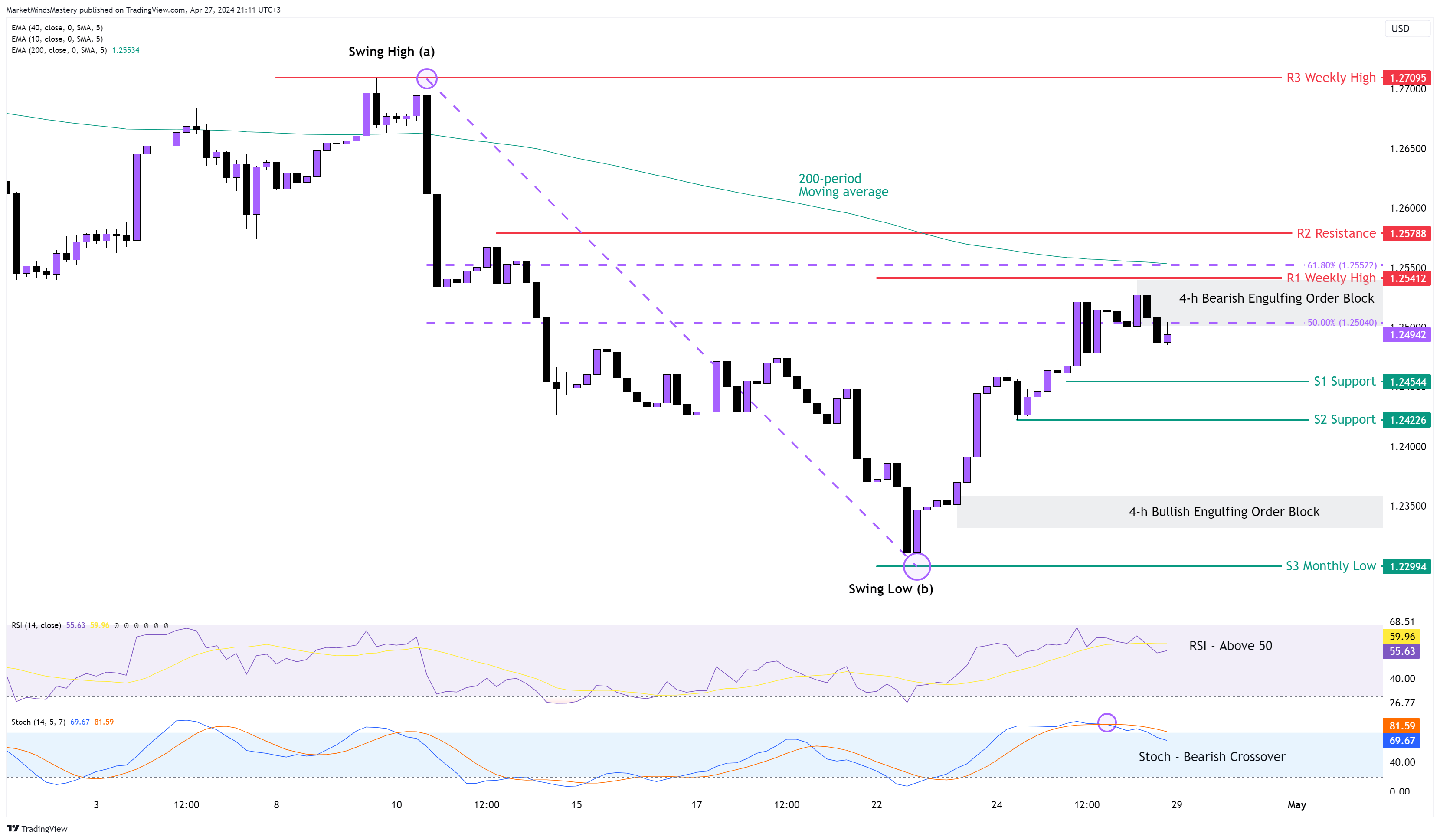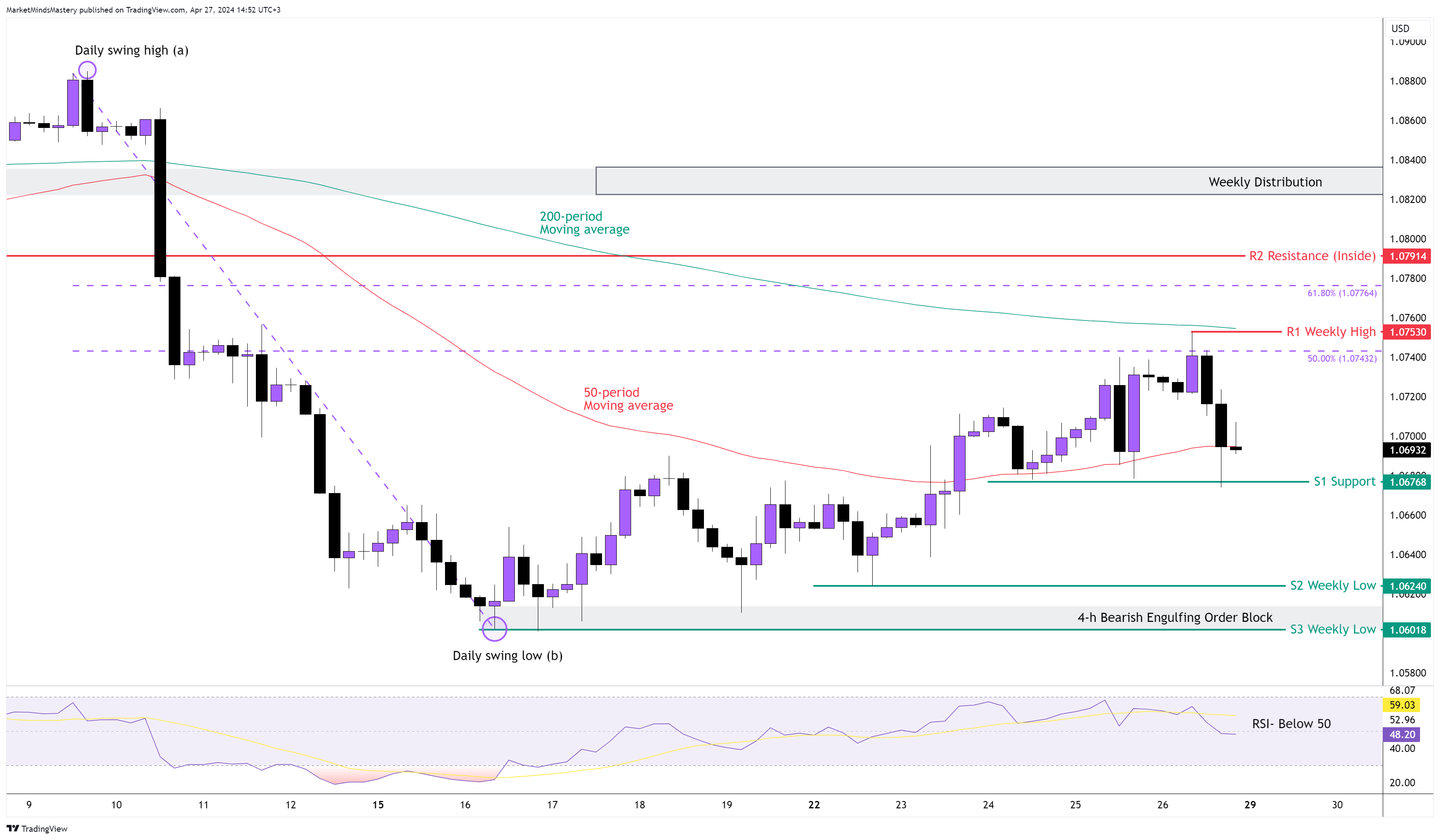 La acción del precio semanal terminó siendo una vela Bullish Engulfing Reversal. El gráfico de 4 horas mostró una tendencia alcista, con máximos y mínimos más altos. El último movimiento, intentando crear un nuevo máximo, fue acompañado por una falsa ruptura justo por debajo del retroceso de Fibonacci del 61,8%, y el precio bajó, creando un Bloque de Orden Envolvente Bajista de 4 horas. Aunque el precio creó soporte en S1, no fue suficiente para convertir la tendencia alcista en bajista. En cuanto al RSI, se encuentra por encima de 50, y esto tiene implicaciones alcistas. El oscilador estocástico se cruzó en la zona de sobrecompra, y el precio está por debajo de la media móvil de 200 periodos lo que tiene implicaciones bajistas.