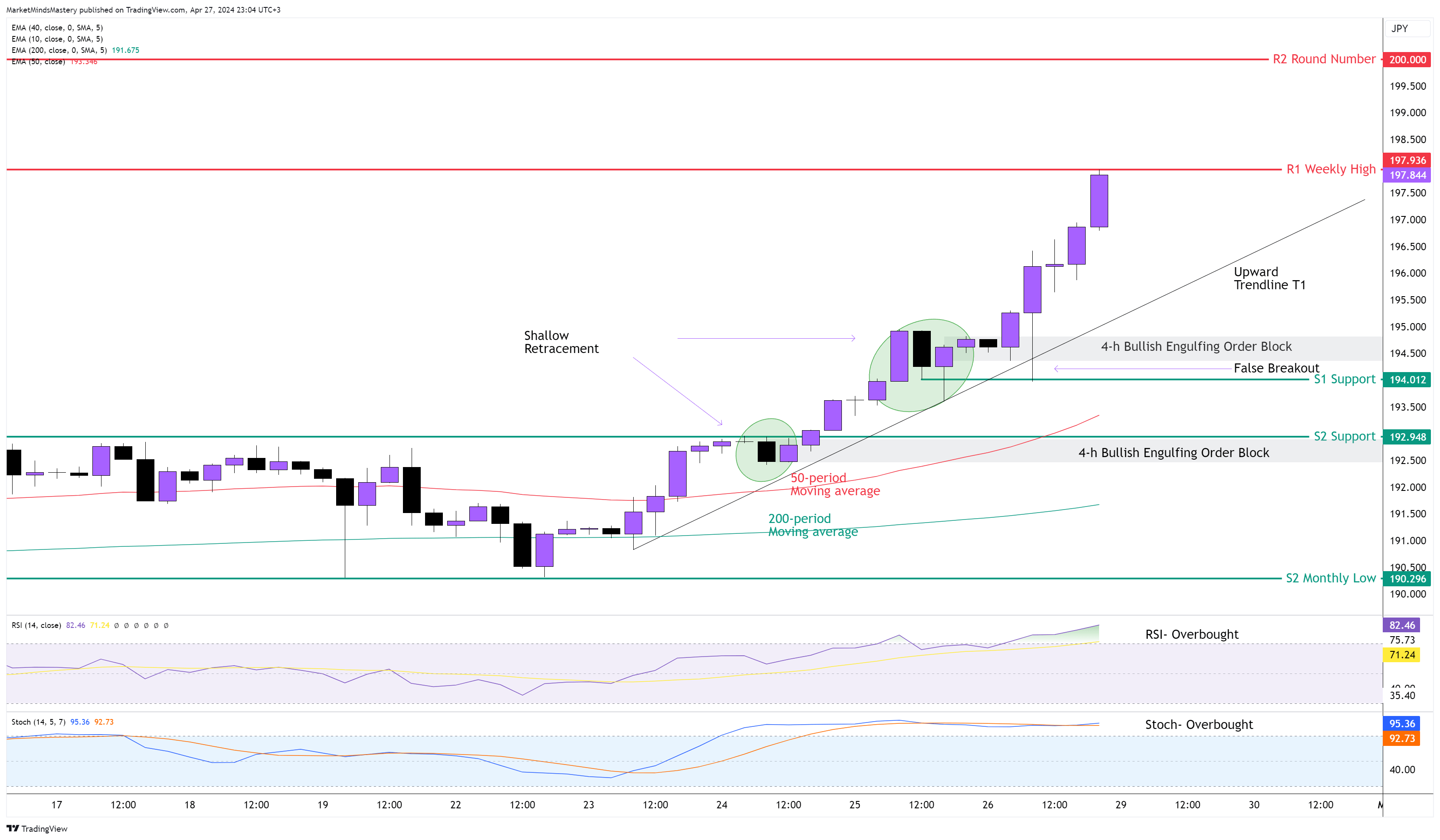 El 50 está por encima de la media móvil de 200 periodos, lo que también es alcista. Como el precio no ha formado una acción de precio de reversión, no podemos definir el máximo de oscilación como el punto de inflexión. Por lo tanto, si el precio sigue subiendo, el máximo de la semana anterior se convertirá en la resistencia R1, alrededor de 197,936. Si el precio la supera, la siguiente resistencia, R2, se situará aproximadamente en la zona de 200. Una vez que el precio comience a corregir, el primer soporte, S1, se encuentra alrededor de 194 con un Bullish Engulfing Order Block. Si el precio se mueve a la baja y cierra por debajo del S1, encontrará la siguiente zona de soporte, S2, alrededor de 193.