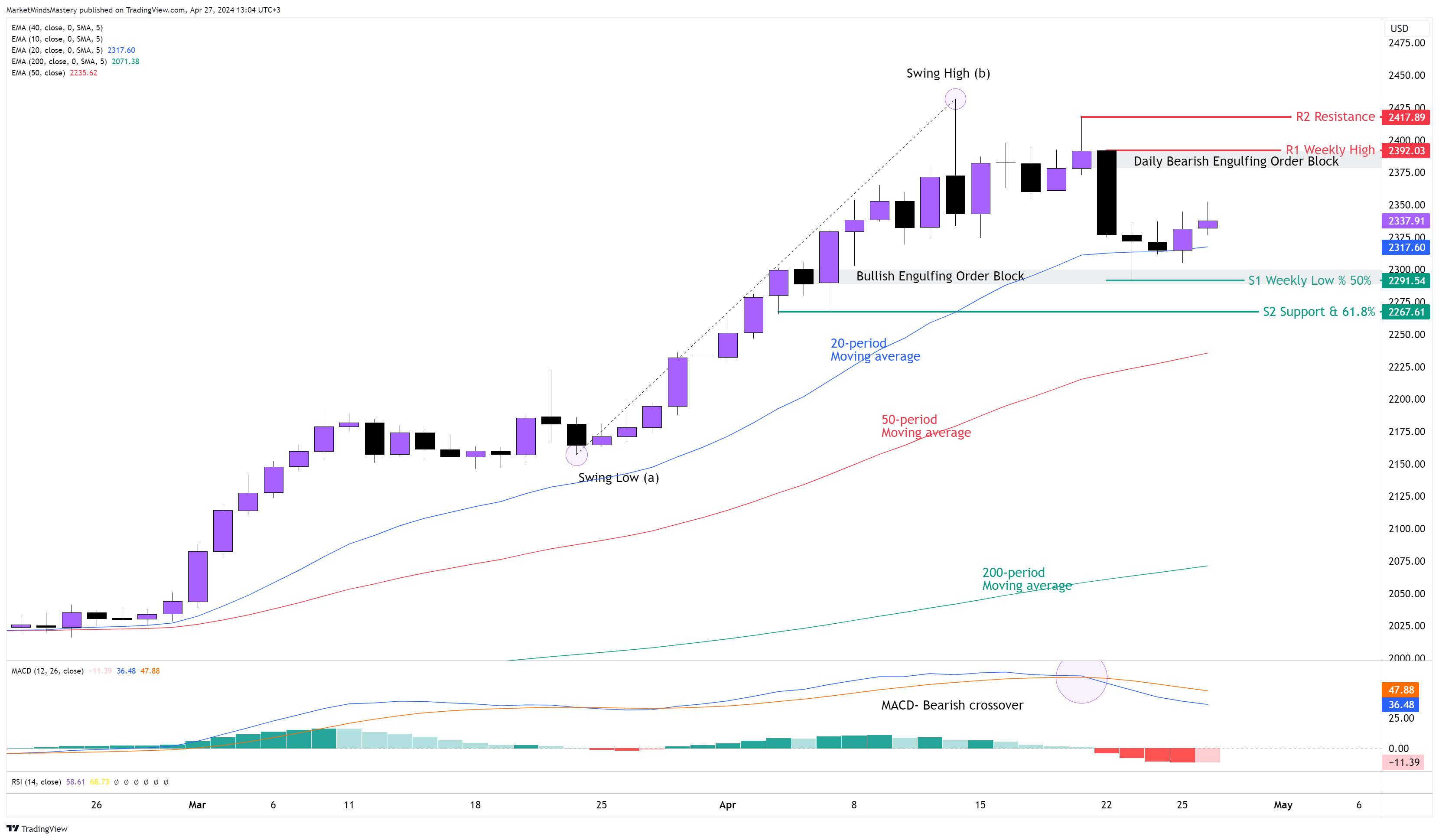 Si el precio se mueve a la baja, la primera zona de soporte S1 será el mínimo de la semana anterior, en torno a los 2.300 $. Este nivel también incluye un grupo de retrocesos del 50% y un Bullish Engulfing Order Block. Si el precio se mueve por debajo del S1, la siguiente zona de soporte, S2, es un mínimo Diario que también consiste en la Golden Ratio del 61,8%. Por el contrario, si el precio sube y se reanuda la tendencia alcista diaria, la primera zona de resistencia, R1, es el máximo de la semana anterior, justo por debajo de 2400$. En ese nivel, se creó un Bearish Engulfing Order Block. En caso de que el precio penetre el R1 y se mueva al alza, la siguiente zona de resistencia, R2, será el máximo de la vela shooting star, en torno a los 2417 $.