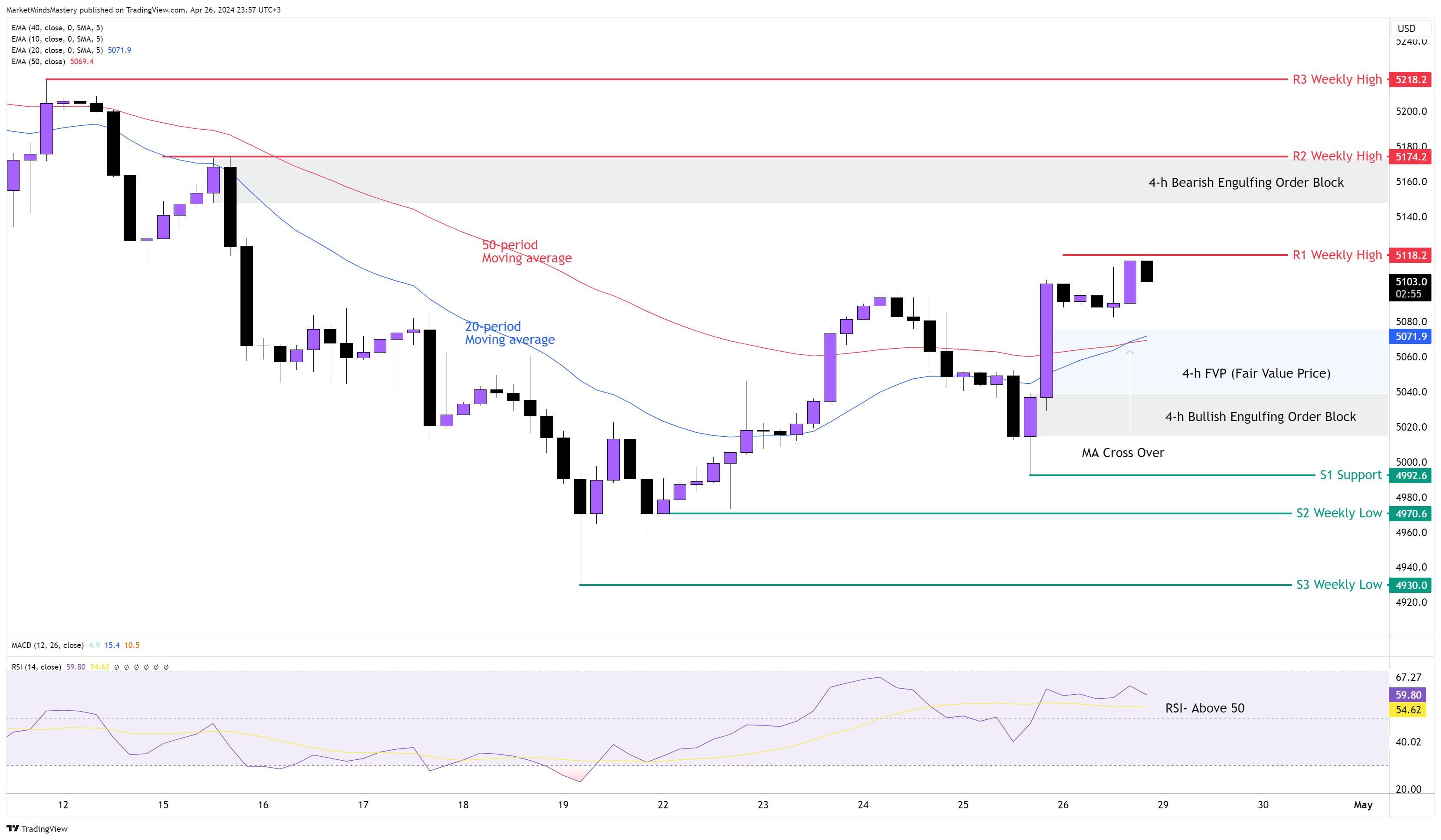 Considerando los máximos y mínimos más altos del precio, el RSI está por encima de 50, y el cruce alcista del 20-periodo por encima de la 50-media móvil, Si el precio sigue subiendo, la tendencia alcista semanal se reanudará, y la primera zona de resistencia, R1, será el máximo de la semana anterior, en torno a los 5118 dólares. Si el precio penetra el R1 y sigue subiendo, la siguiente zona de resistencia, R2, será $5174. El Bloque de Orden Envolvente Bajista formado en R2 puede provocar una reacción en el precio debido a las órdenes de venta acumuladas.