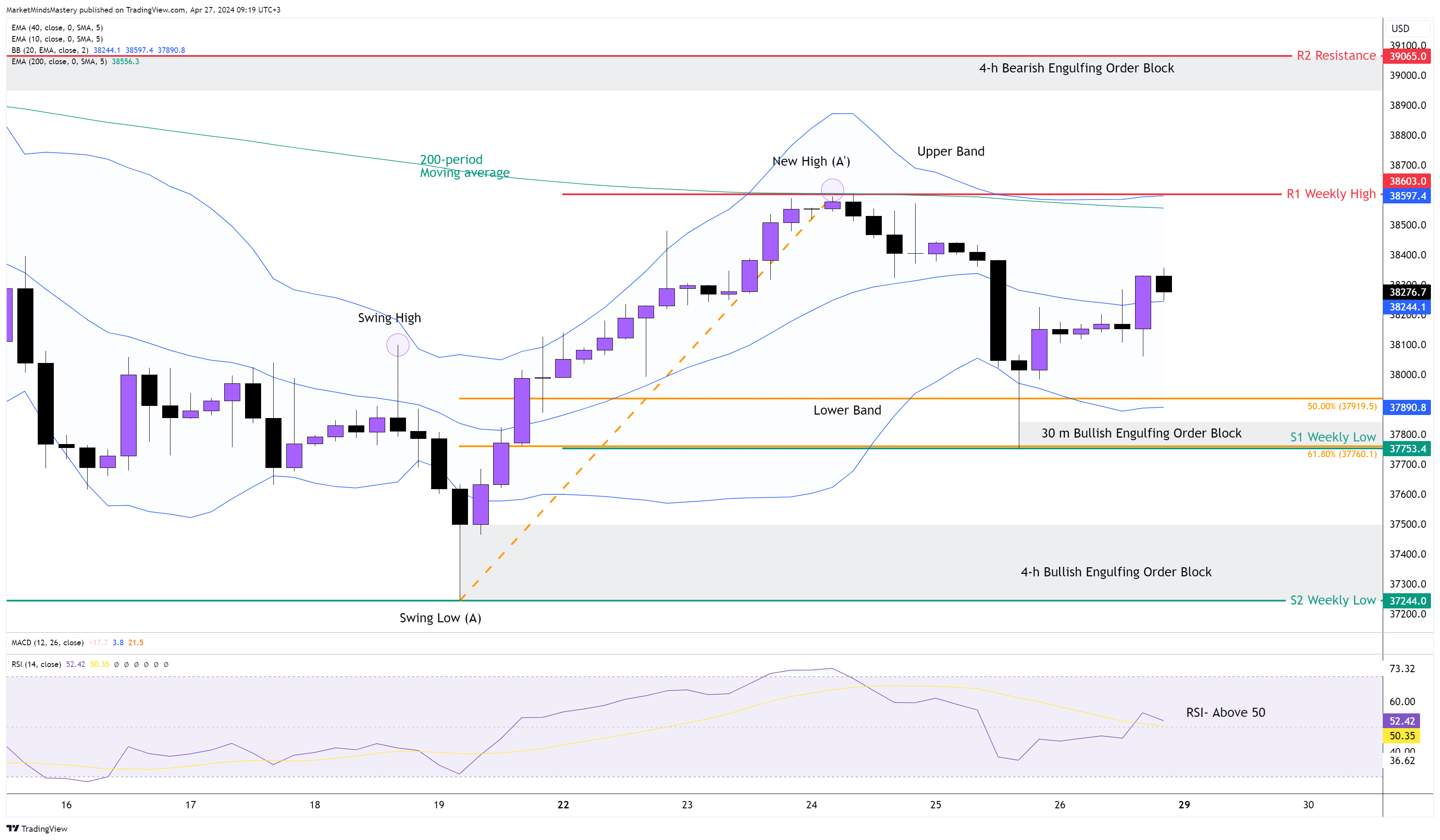 Oppositivamente, si el precio retrocede y se mueve a la baja, la primera zona de soporte, S1, será baja, en torno a los 37753 $. Una ruptura y cierre por debajo del S1 puede disminuir el precio y alcanzar la zona de soporte S2, alrededor de 37244$.