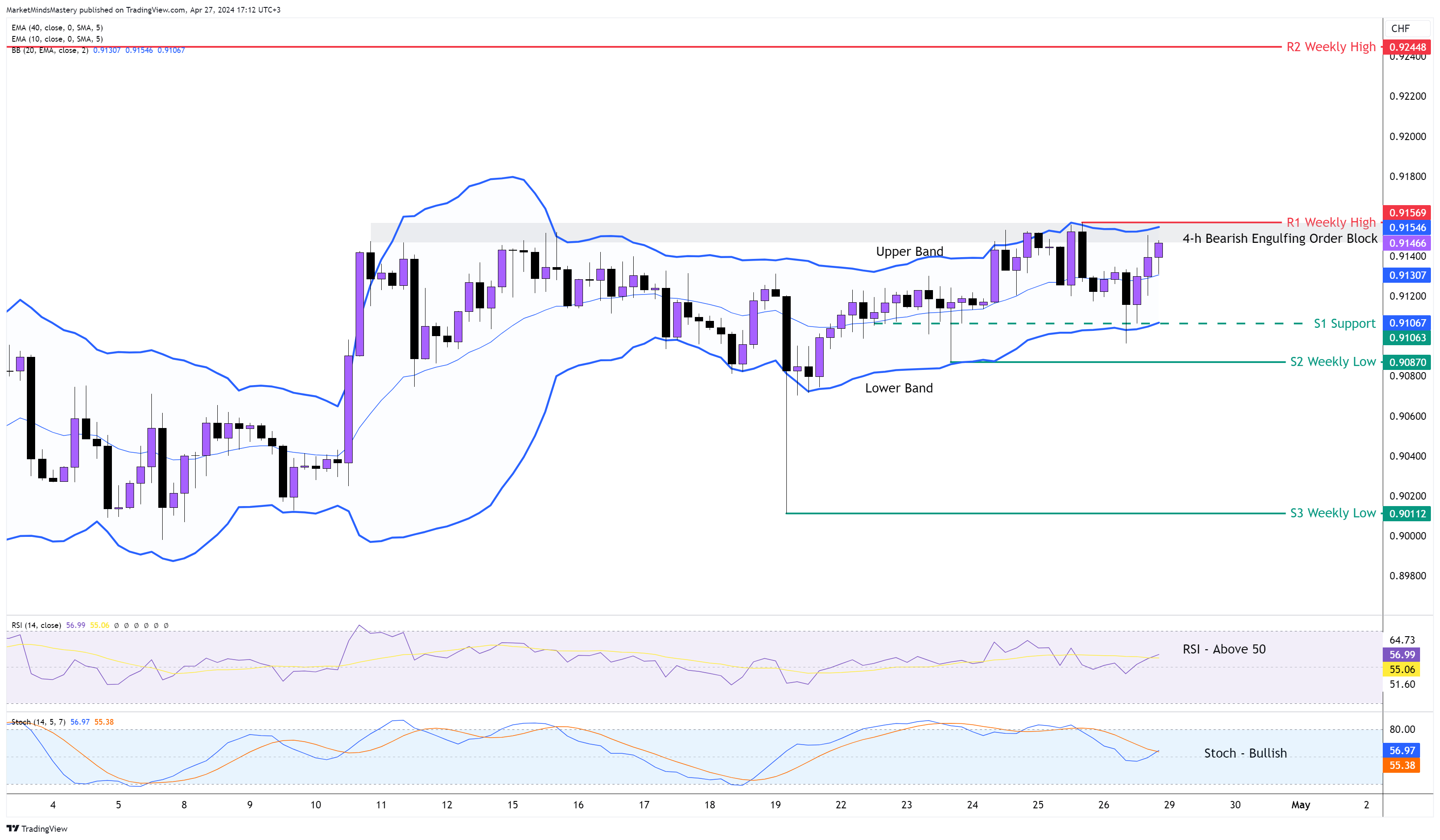 Actualmente, el precio cotiza alrededor de la banda superior, donde se forma un Bearish Engulfing Order Block. Si el precio rompe por encima del máximo de la semana anterior, marcando la resistencia R1 alrededor de 0,91569 y moviéndose al alza, la siguiente resistencia, R2, está a unos 80 pips de distancia, cerca de 0,92448. Por otro lado, si el precio declina y se mueve a la baja, el primer soporte, S1, es el área alrededor de 0.91067. Si el precio cierra por debajo del S1 y se mueve hacia abajo, el siguiente soporte, S2, será el mínimo de la semana anterior alrededor de 0.90870.
