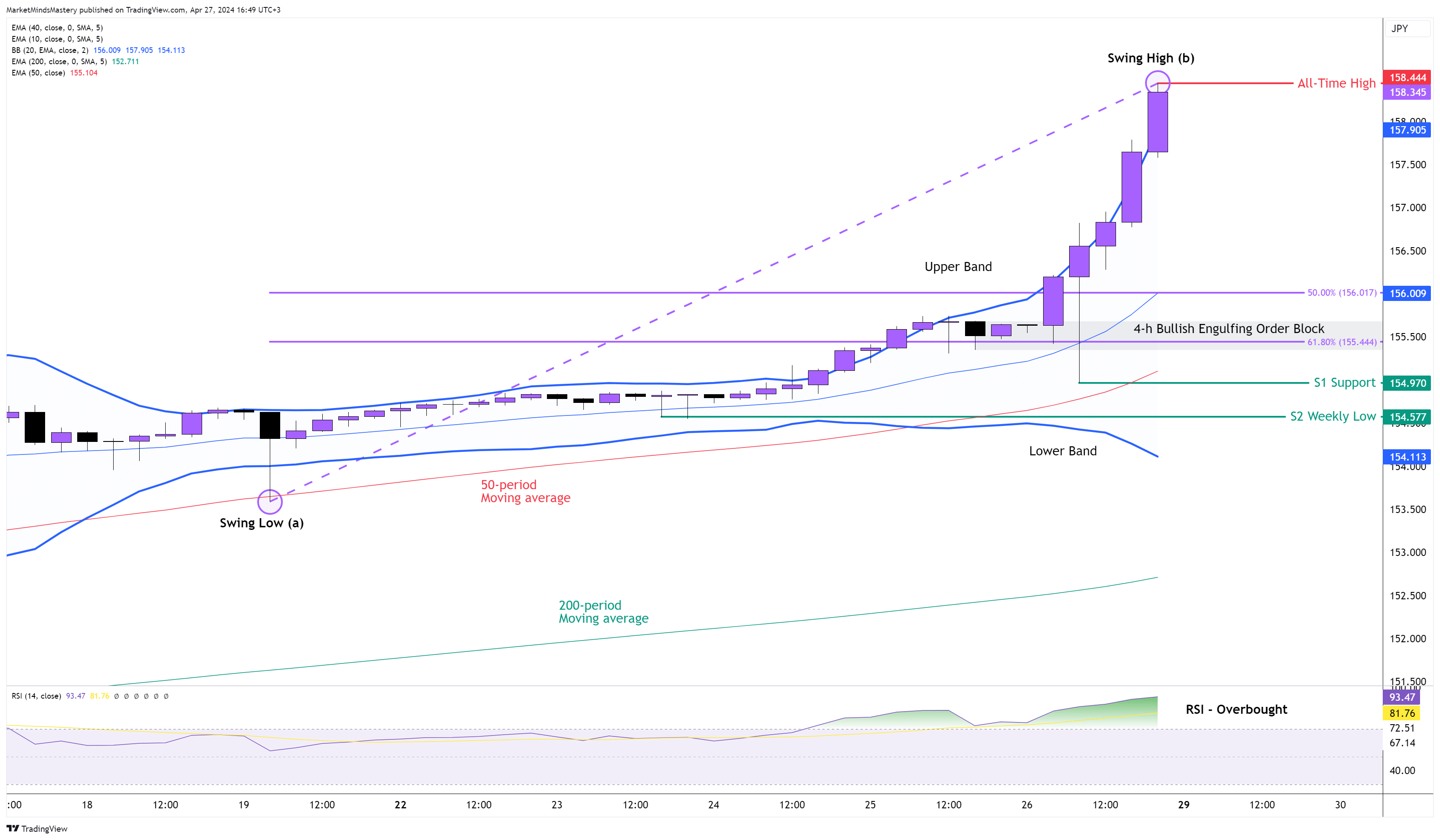 La semana pasada, fuimos testigos de la aplicación de la correlación de divisas. El dólar fue una de las divisas más fuertes, y esperábamos movimientos más contundentes por parte del billete verde. Lo mencionamos mucho en el análisis de la semana anterior. También dijimos claramente que si el yen se debilitaba y el dólar seguía dominando, sería posible una ruptura alcista. La semana pasada, el precio hizo lo que esperábamos, y el mercado explotó al alza. El precio ahora registró un nuevo THA (Máximo de todos los tiempos) alrededor de 158,44. El precio está "caminando por la banda superior", lo que se considera alcista. La media móvil de 50 periodos está por encima de la media móvil de 200 periodos, y su distancia se amplía.