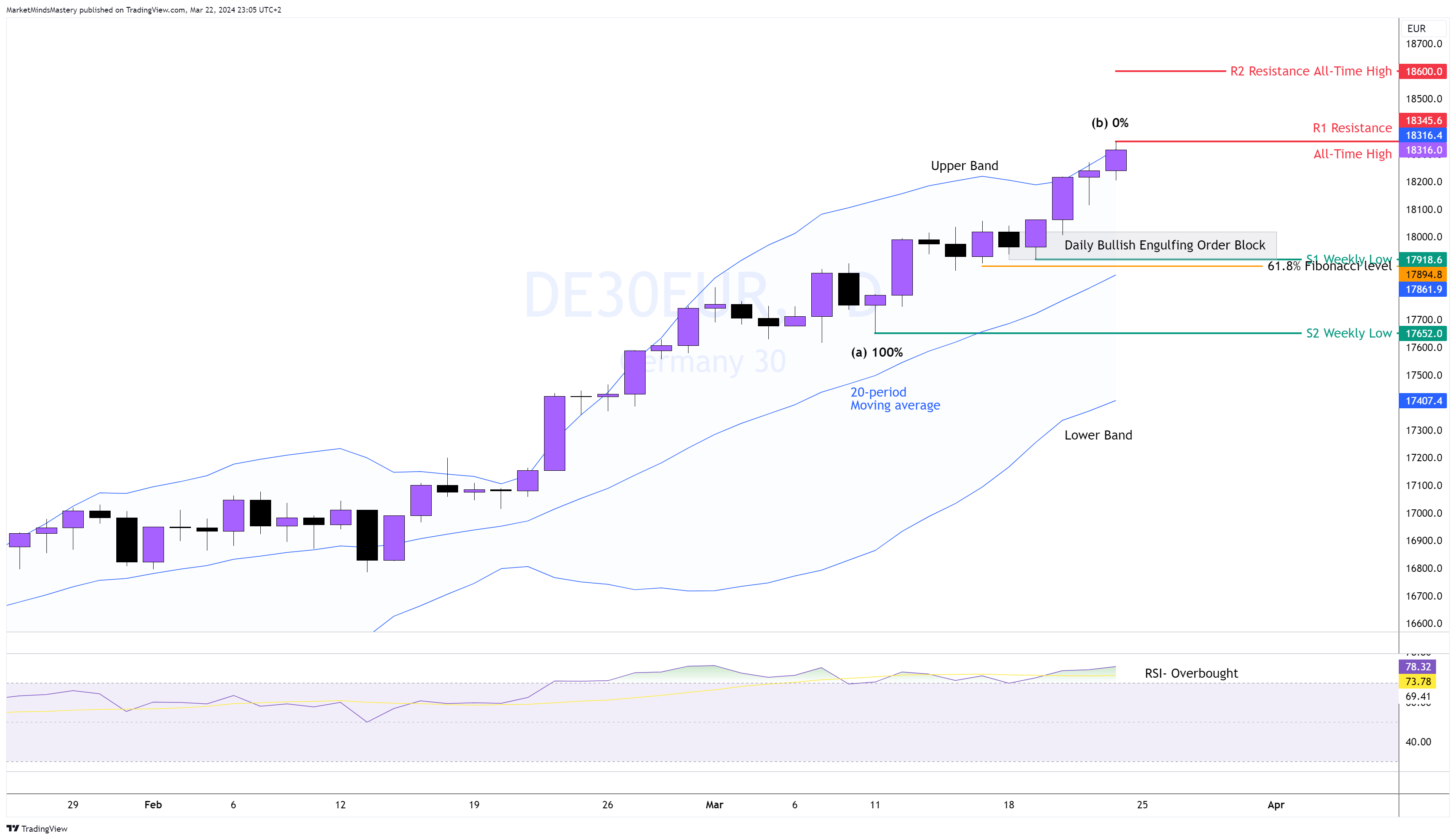 Since the beginning of February, the price has traded above the middle of the Bollinger Bands, which is the 20-period moving average, indicating a bullish market. The RSI is highly Overbought, indicating a steadily rising market. Therefore, if the price continues to increase, the existing All-Time high becomes the prominent resistance. A break and a close above it will lead the price to make a new All-Time High, estimated at around 18600.