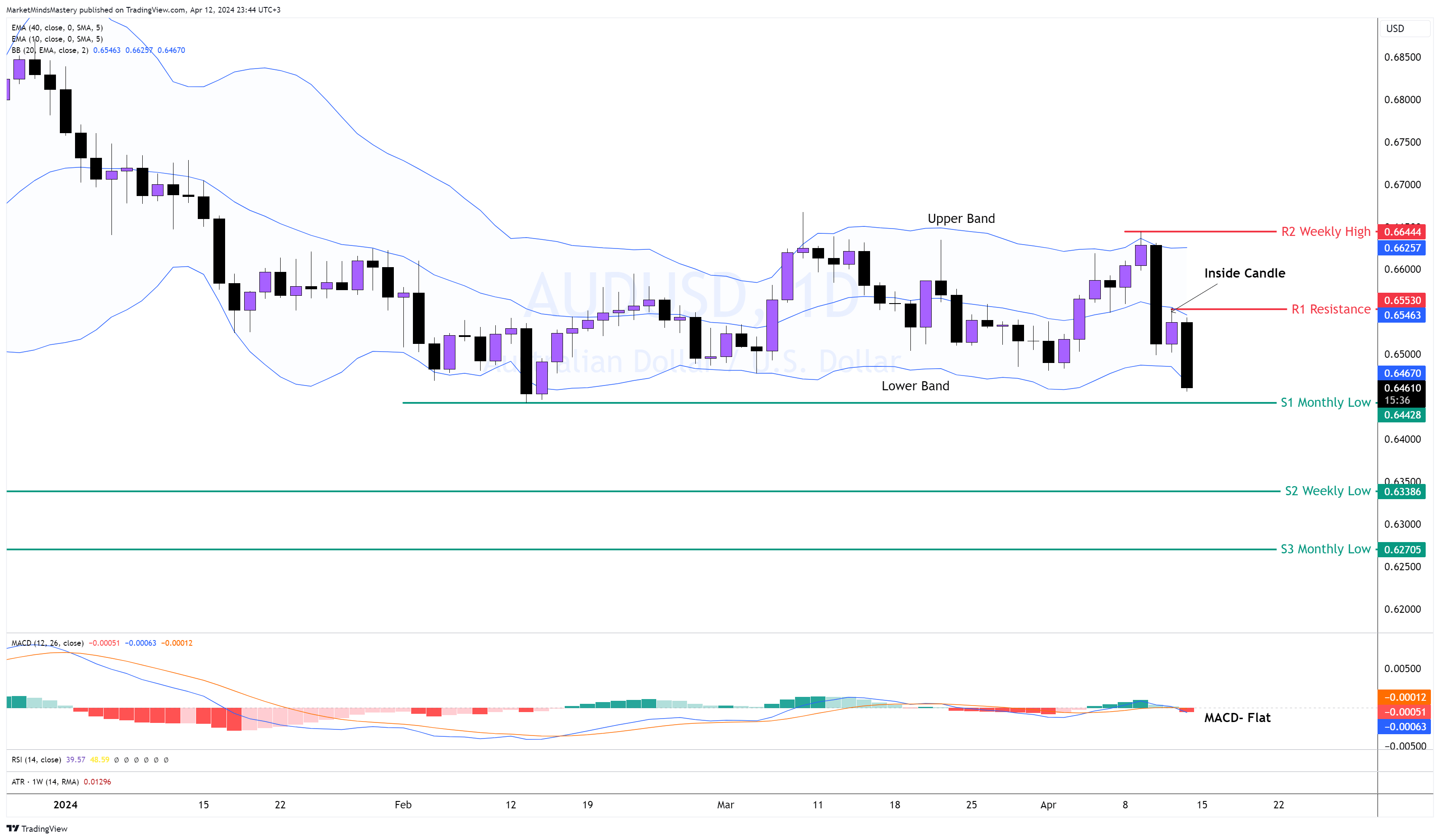 Sebbene il dollaro USA sia stato la valuta più forte la scorsa settimana e si sia mosso più del suo intervallo reale medio, l'AUD è stata la prossima valuta più forte secondo le misure di forza e correlazione delle valute. Nonostante il USD sia stato il più robusto, la coppia AUDUSD non ha creato una tendenza al ribasso e si è mantenuta entro i confini di 0,66444 e 0,64428. Come vediamo nel grafico sopra, le bande superiori e inferiori puntano nella stessa direzione e sono parallele. Inoltre, il MACD è piatto intorno alla linea dello zero e l'istogramma mostra un equilibrio di ordini di acquisto e di vendita. Quindi, se il prezzo si muove al ribasso, la prima area di supporto, S1, è un basso mensile di circa 0,64428. Se il prezzo rompe e chiude sotto S1 e si muove verso il basso, la prossima area di supporto, S2, è un vecchio minimo settimanale di circa 0,63386. Un ulteriore declino sarà individuato nel test del supporto S3, intorno a 0,62705.