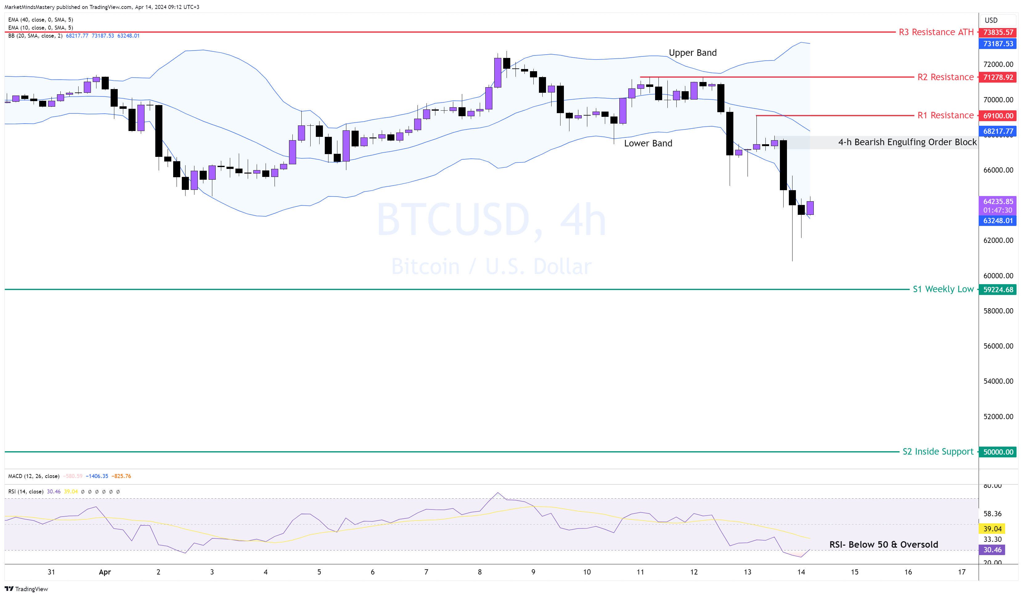 Dopo il rifiuto del massimo storico di circa 73835 dollari un mese fa, il prezzo ha iniziato la fase di correzione, registrando massimi e minimi inferiori. Osservando le candele della scorsa settimana, notiamo che quelle nere (ribassiste) sono più lunghe in quantità rispetto alle candele rialziste. In particolare, nel precedente movimento al ribasso, il prezzo ha creato un minimo inferiore e la Banda superiore ha puntato verso l'alto, mostrando un forte breakout del mercato. Questo è il modo in cui le Bande di Bollinger possono convalidare i forti breakout. Durante l'ultimo movimento al ribasso, il prezzo ha creato un Bearish Engulfing Order Block, che può essere utilizzato per opportunità di trading secondo le strategie dei trader.