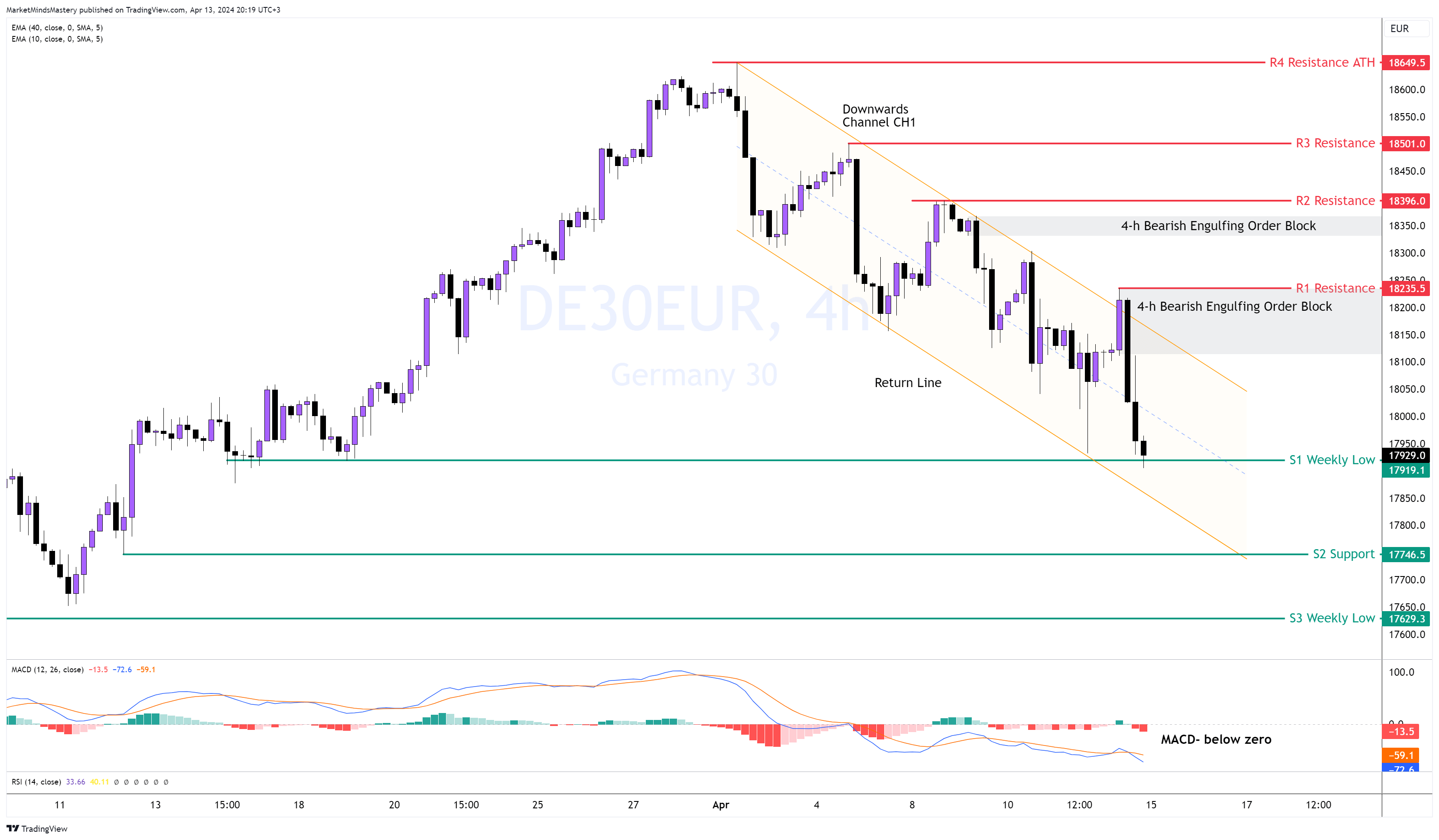 Se il prezzo troverà supporto a partire da lunedì e si muoverà verso l'alto, la resistenza R1 sarà il primo livello di prezzo significativo, intorno a 18235, con un Bearish Engulfing Order Block seduto lì. Inoltre, la trendline discendente del CH1 si trova approssimativamente allo stesso livello. Se il prezzo penetra la R1 e si muove verso l'alto, la prossima area di resistenza, R2, si trova intorno a 18396. D'altra parte, se il prezzo continua a muoversi verso il basso, la prima area di supporto diventa la linea di ritorno del canale CH1, con un livello statico significativo della S2 di circa 17746. Un ulteriore calo può portare il prezzo al livello di supporto S3, che è un minimo settimanale, intorno a 17629.
