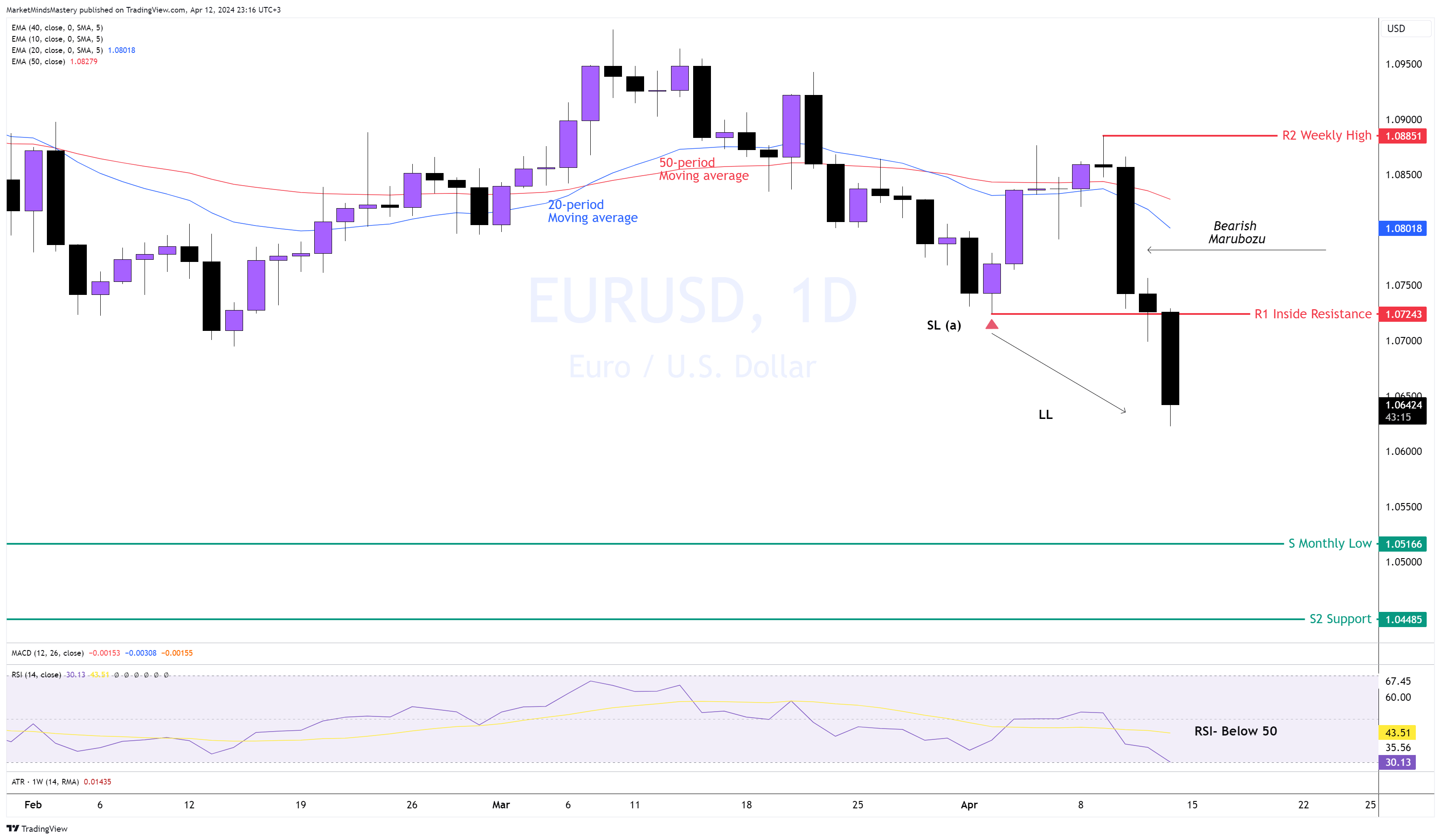 Quindi, la struttura del mercato sul grafico giornaliero si è spostata, con il SL (a) (swing low al punto a) che è stato rotto.Indica uno sbilanciamento tra ordini di acquisto e di vendita, che è ribassista. Inoltre, la media mobile a 20 periodi ha incrociato la media mobile a 50 periodi, indicando un ribasso. RSI è al di sotto di 50, anch'esso con implicazioni ribassiste. Queste tendenze suggeriscono che se il prezzo continua a muoversi verso il basso, la prima area di supporto, S1, è un livello mensile di circa 1,05166. Se il prezzo supera e scende ulteriormente, il supporto successivo, S2, si trova intorno a 1,04485. Se il prezzo si muove verso l'alto, la prima area di resistenza, R1, è una resistenza interna intorno a 1,07243. Se il prezzo la penetra e si muove verso l'alto, le medie mobili a 20 e 50 periodi dovrebbero agire come resistenza dinamica del mercato.