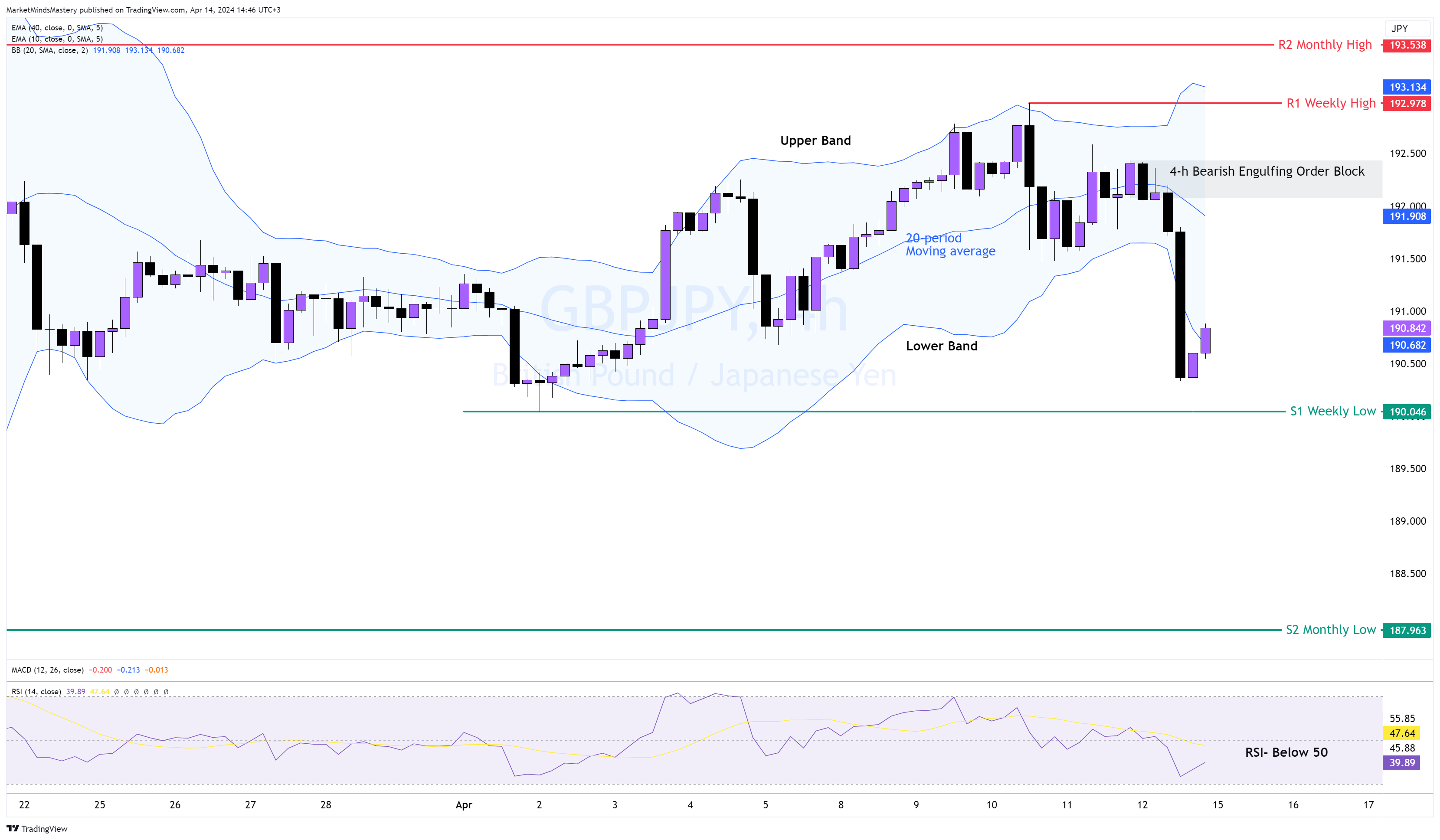 Pertanto, se il prezzo si muove verso l'alto, la prima area di resistenza sarà il Bearish Engulfing Order Block mostrato nel grafico precedente. Se il prezzo penetra l'OB e si muove verso l'alto, la parte superiore dell'intervallo sarà la resistenza R1, che è stata il massimo della settimana precedente a 192,978 circa.