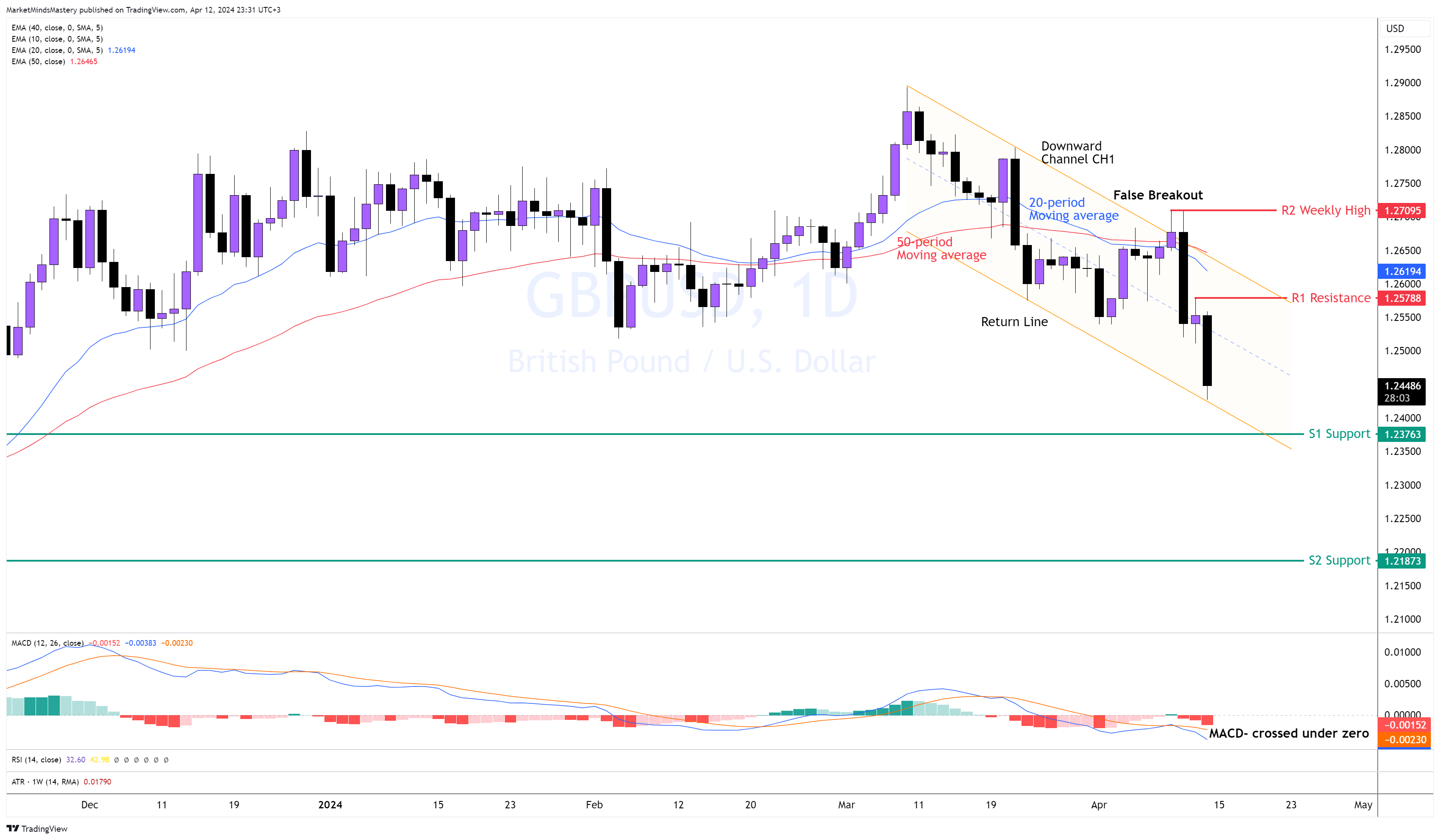 In seguito alla candela Bearish Engulfing creata sul grafico settimanale, il prezzo si è mosso al ribasso con una serie di massimi e minimi inferiori sul grafico giornaliero. Il grafico precedente mostra che il comportamento del prezzo può essere catturato utilizzando un canale discendente CH1. Durante il retest del canale discendente la scorsa settimana, il prezzo è stato respinto dal livello di resistenza che avevamo indicato nella nostra analisi, e si è creata una struttura di mercato che ha definito una tendenza al ribasso. La media mobile a 20 periodi è sotto la media mobile a 50 periodi, il che indica una pressione di vendita. Il MACD ha attraversato la linea dello zero, indicando anch'esso bearishness.