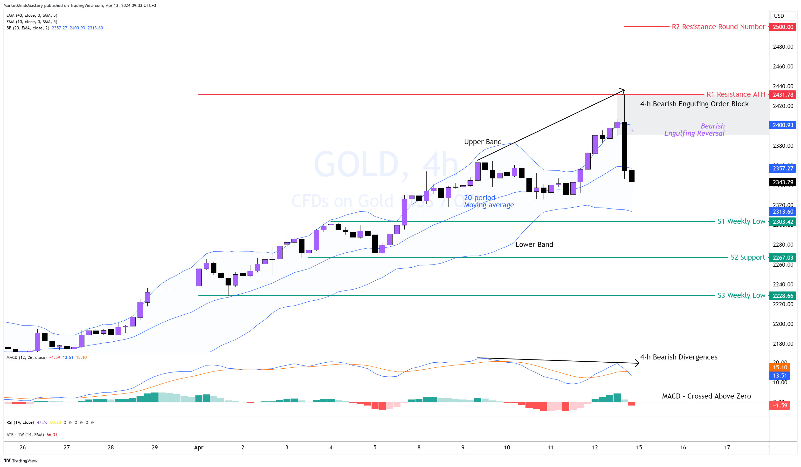 Da lunedì, la banda inferiore può essere un supporto dinamico se il prezzo si muove verso il basso. Tuttavia, il minimo della settimana precedente, S1, sarà un supporto rilevante per il mercato a circa 2.300 dollari. Se il prezzo chiude sotto S1 e continua a muoversi verso il basso, la prossima area di supporto, S2, sarà a circa 2267 dollari.
