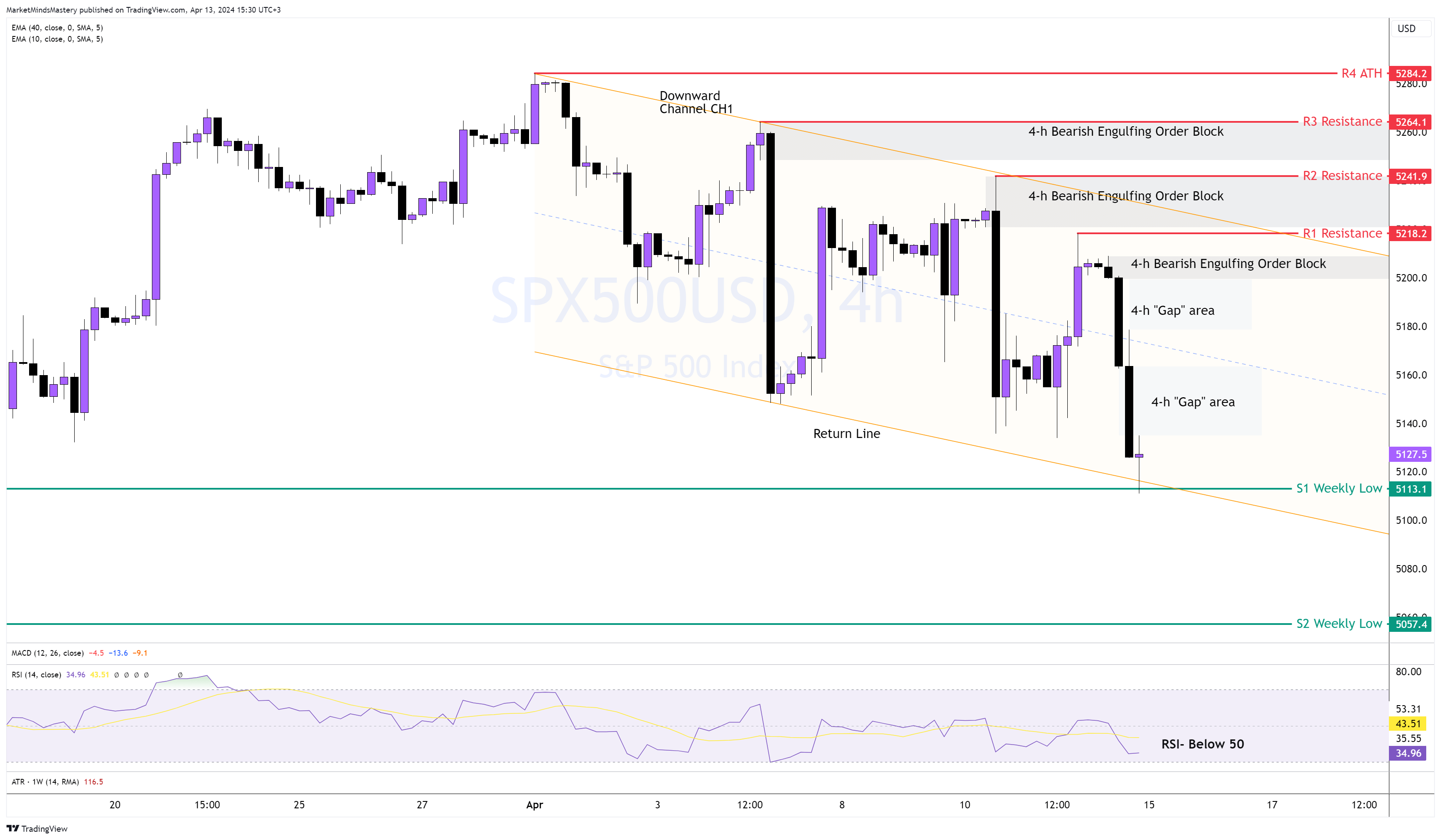 In seguito alle previsioni della settimana precedente, il prezzo dell'SP 500 sul grafico settimanale è stato seguito e il mercato è sceso, causando la correzione settimanale dei prezzi. Sul grafico a 4 ore, il prezzo si presenta come una tendenza al ribasso con una serie di massimi e minimi inferiori, che possono essere stabiliti all'interno di un canale discendente CH1. Le candele ribassiste estese sul grafico definiscono gli ordini di vendita aggressivi accumulati durante gli eventi di notizie significative negli Stati Uniti. L'oscillatore RSI si trova sotto la linea centrale, indicando ribasso. Attualmente, il prezzo è supportato dal livello S1, che rappresenta un minimo settimanale, e il mercato lo ha rispettato il venerdì precedente. Quindi, se il prezzo rimane al di sopra del supporto S1 e si muove verso l'alto, il "Gaps" sarà probabilmente riempito e il prezzo potrebbe entrare nel Bearish Engulfing Order Block sotto la resistenza R1 intorno a 5218 dollari. La confluenza della R1 e della linea di tendenza CH1 può causare una battuta d'arresto dei prezzi. Se il prezzo penetra la R1 e si muove verso l'alto, la prossima area di resistenza, R2, si trova intorno a $5241, con un altro ben definito Bearish engulfing Order Block presente.
