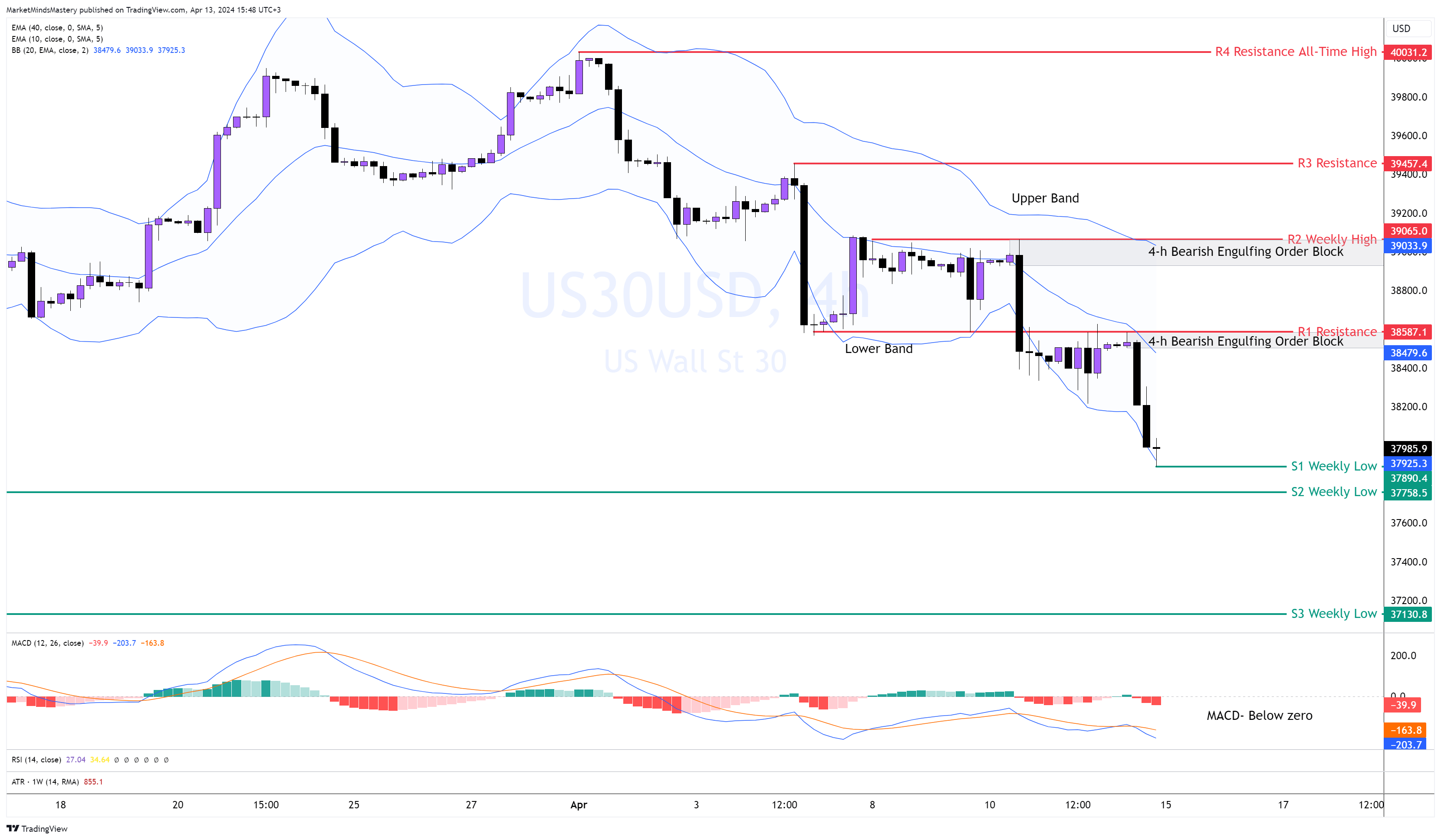 Dopo il movimento al ribasso della scorsa settimana, il prezzo ha continuato a scendere, creando una serie di massimi e minimi inferiori. Se il grafico settimanale riprende il suo movimento verso l'alto, vedremo un cambio di direzione del mercato sul grafico a 4 ore, da una tendenza al ribasso a una tendenza al rialzo. Utilizzando le Bande di Bollinger, il mercato è ben al di sotto della metà della BB, equivalente alla media mobile a 20 periodi. Il mercato ha creato due Bearish Engulfing Order Block nelle ultime due gambe impulsive. Il MACD è sotto la linea dello zero, indicando ribasso nel time frame a 4 ore. Pertanto, se il prezzo continua a muoversi verso il basso, la prima area di supporto sarà il minimo della settimana precedente, S1, circa 37890 dollari. Se il prezzo penetra in S1 e continua il suo movimento di scaricamento, la prossima area di supporto, S2, è intorno a $37758.
