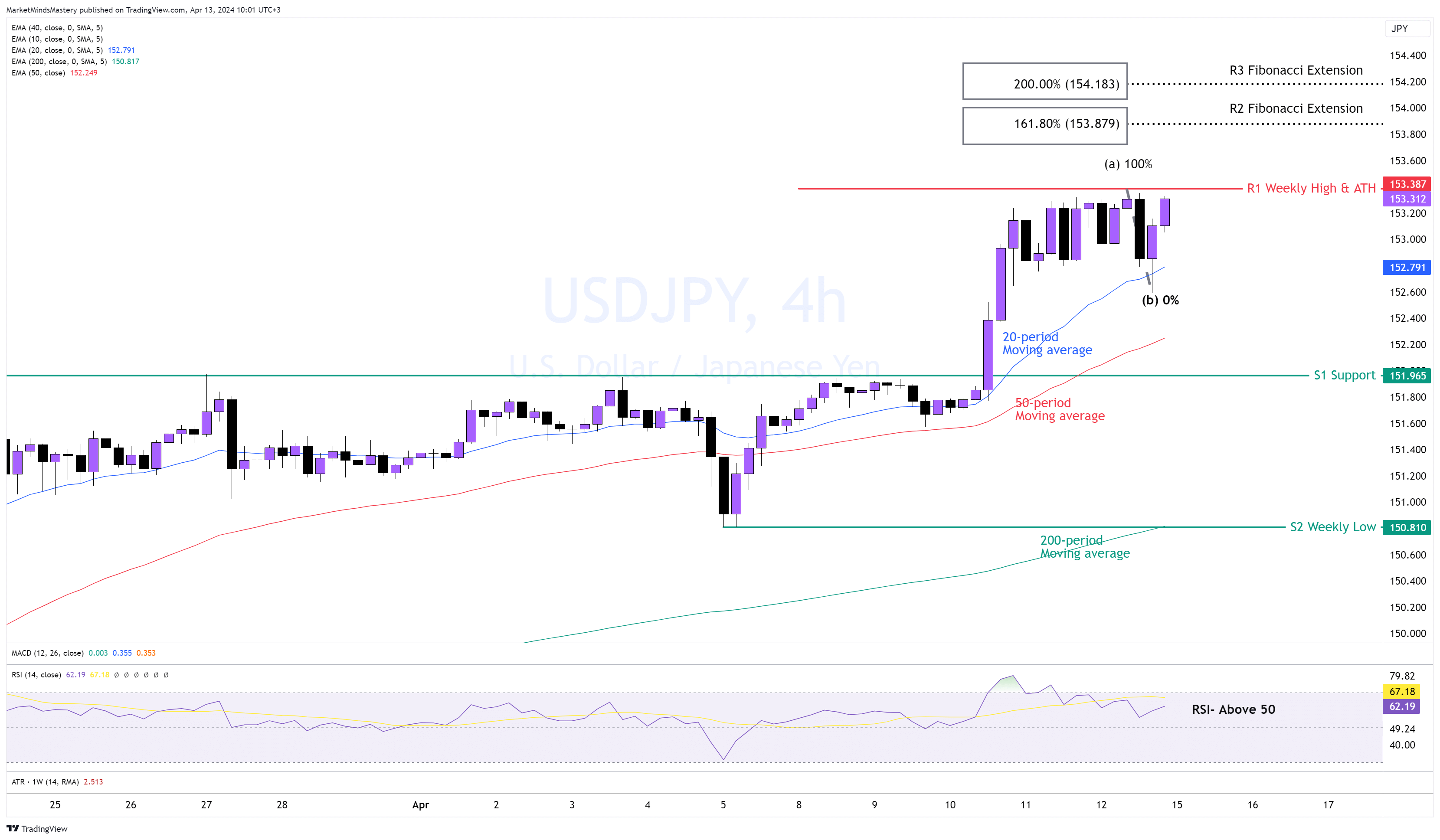 Il mercoledì precedente, il numero positivo dell'IPC negli Stati Uniti ha provocato una mossa rialzista sull'USDJPY, e il prezzo ha creato un massimo più alto, registrando un nuovo Massimo storico. Tutte e tre le medie mobili, 20, 50 e 200, sono in ordine, indicando turbolenza, con il prezzo che rispetta costantemente la media mobile a 20 periodi su questo grafico a 4 ore. Il fatto che il prezzo rimbalzi dalla MA a 20 periodi rivela che i ritracciamenti sono poco profondi. L'RSI è superiore a 50, indicando turbolenza. Se il prezzo continua a salire, il massimo della settimana precedente, intorno a 153,38, è la resistenza R1. Supponiamo che il prezzo lo superi e si muova ancora più in alto per trovare la prossima possibile resistenza. In questo caso, possiamo utilizzare l'estensione di Fibonacci con 161,8% e 200% che sono, rispettivamente, la resistenza R2 intorno a 153,87 e la resistenza R3 intorno a 154,18.