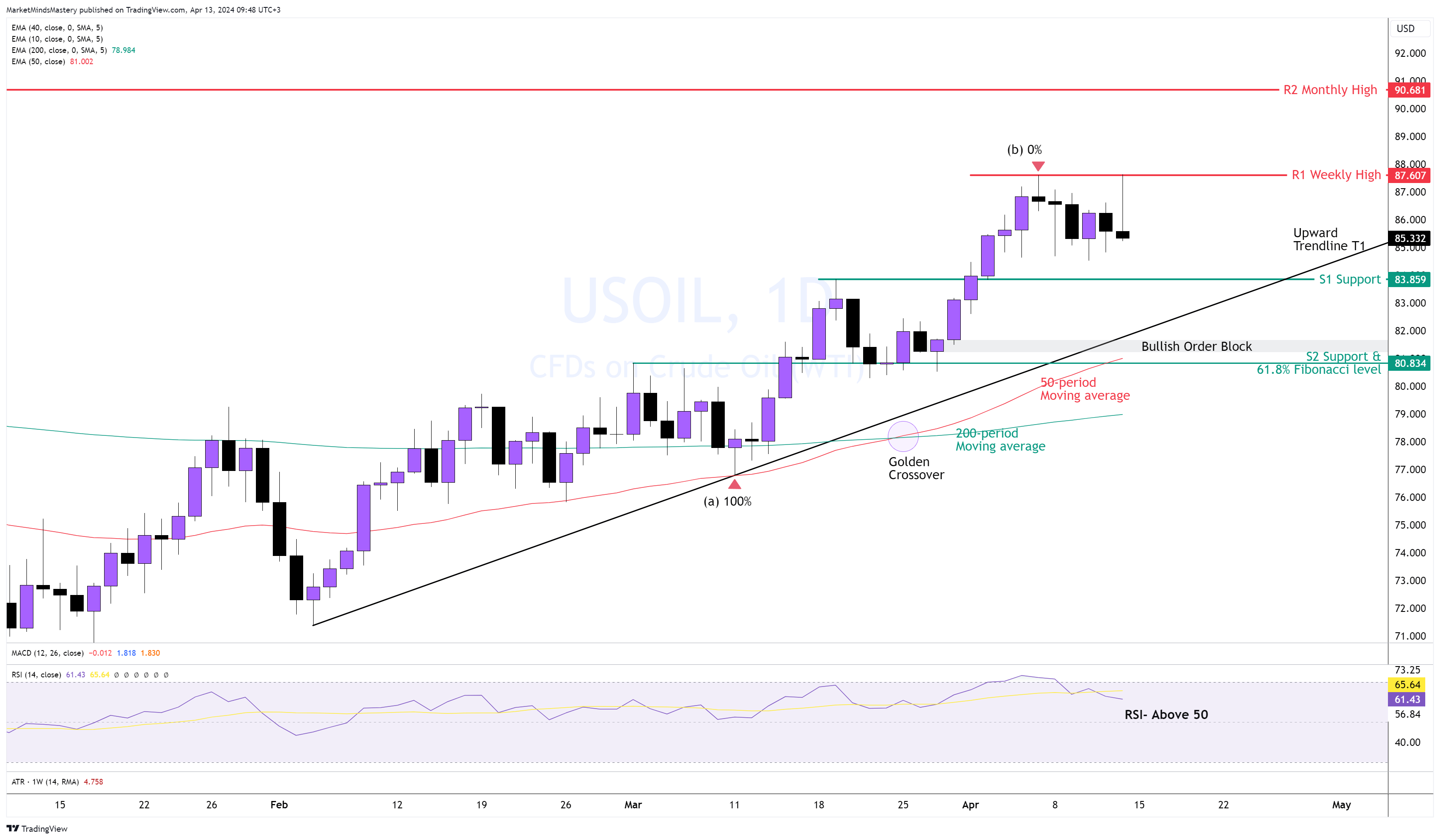Se il prezzo la penetra e si muove verso il basso, l'area di supporto successiva, S2, si trova a circa 80,83 dollari, che è un gruppo di multipli minimi di prezzo, e il rapporto di Fibonacci Golder è del 61,8% se misuriamo dal minimo dello swing al punto (a) al massimo dello swing al punto (b). Anche la media mobile a 50 periodi, la trendline rialzista T1 e un blocco di ordini rialzisti si trovano intorno a quest'area;