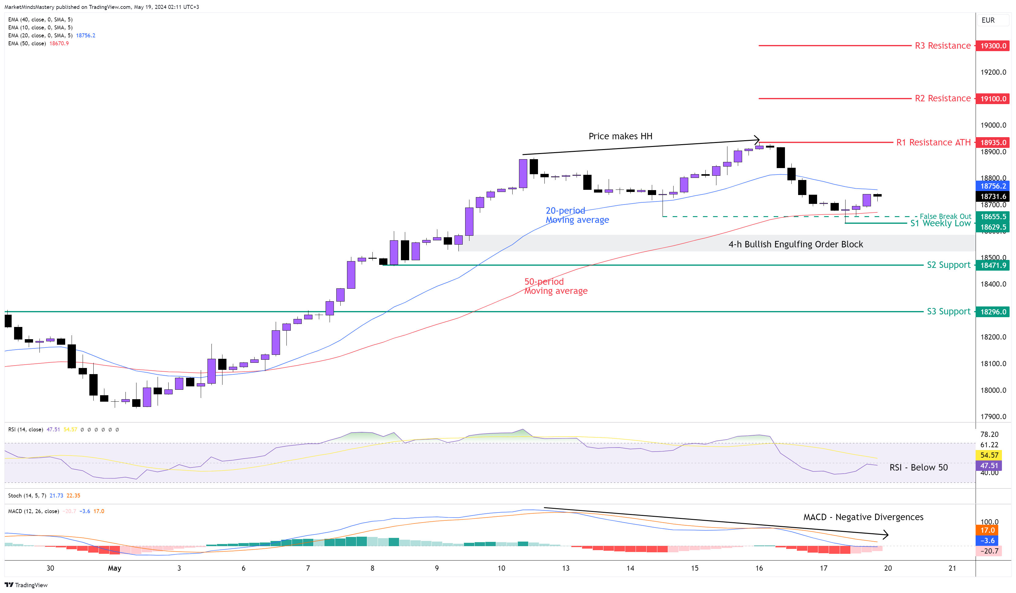Following the uptrend on the weekly chart, the European Indice created a Spinning Top reversal candle at the ATH level. Additionally, the MACD couldn’t follow the ATH and didn’t register for a higher high. This indicates a market weakness and that the upward move is likely running out of stream. The RSI oscillator is under 50, indicating market weakness. Currently, the price is congesting within the 20 and the 50-period moving averages. Both moving averages are flat, pointing in a parallel. Starting Monday, if the price is rejected and moves downwards, the first support area, S1, is the previous week’s low, around 18269. This level had been tested two weeks ago, and the price bounced off. If the price closes under the S1 and moves downwards, the next support area, S2, is approximately 18471. A Bullish Engulfing Order Block was formed a few weeks ago at this level, and it has not yet been tested, making the Order Block significant. On the other hand, if the price finds support, bounces off and moves upwards, the first resistance area, R1, will be the ATH around 18935. If the price penetrates the R1 and moves higher, the next resistance area, R2, will be the 19100.