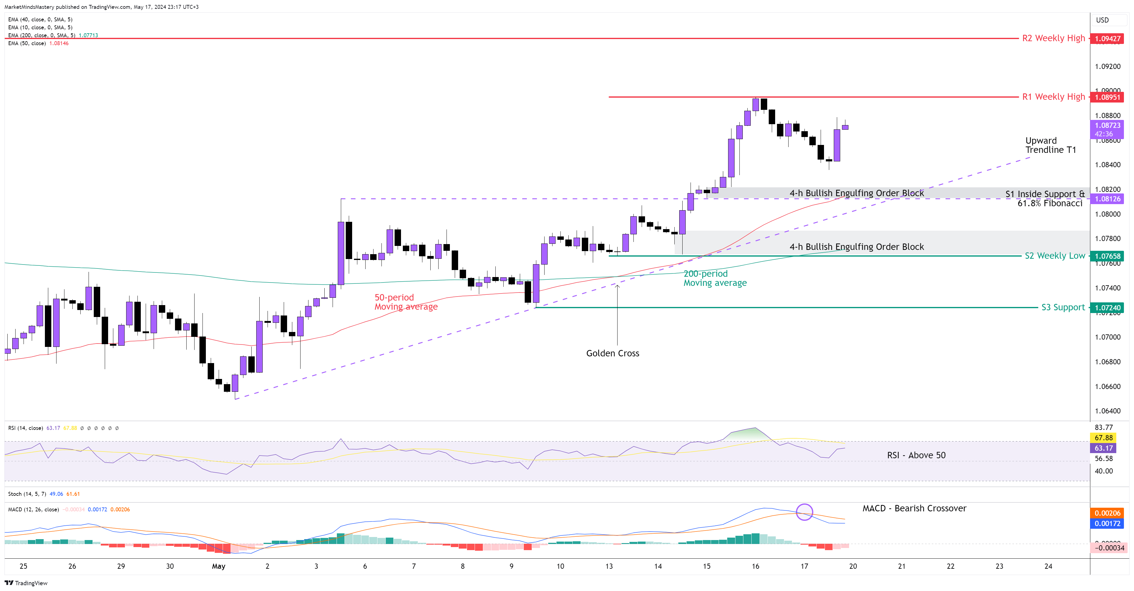 On the other hand, if the price declines and moves downwards, the first support area, S1, around 1.0812, will be considered as a key level of support because the Upwards Trendline T1, an inside support, the 61.8% Fibonacci retracement, the 50-period moving average, and a Bullish Engulfing Order Block cluster at the same level. A lower move can force the price into the following Bullish Engulfing Order Block consisting of the S2 support, a weekly low, around 1.0765, and the dynamic 200-period moving average.