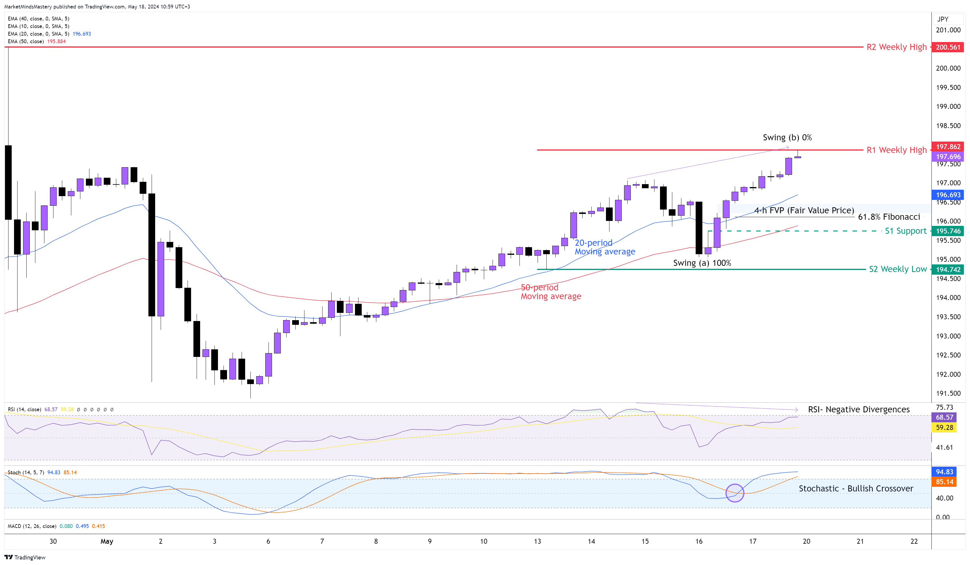 Conversely, if the price declines and moves downwards, the 61.8% Fibonacci level aligns with an FVG and the 20-period moving average area. This combination of confluences can attract buy orders. In case the price declines further, the first static support, S1, is only 30 pips away, around the 195.74 level. A further downward move finds the previous week’s low at around 194.74, which is the S2 support.