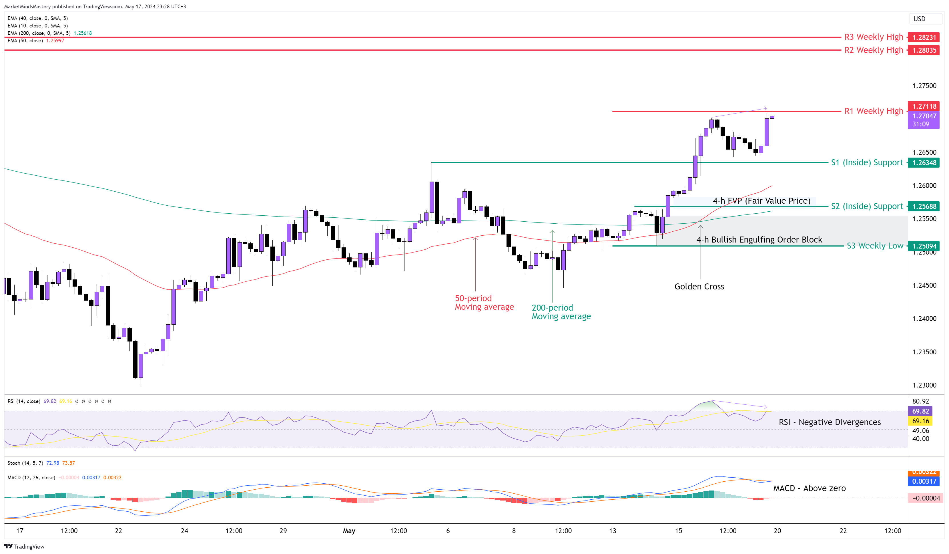 Following the bullish momentum built on the 4-hour chart, the price kept its upward move last week, breaking and closing above the weekly’s inside candle. The price formed a series of consecutive higher highs and higher lows. The 50 and 200-period moving averages created a bullish crossover known as the Golden Cross. The RSI is above 50, which has bullish implications. The MACD is also above its zero line, with a bearish crossover shown on the indicator. If the market continues its upward move, the first resistance level, R1, is the previous week’s high, around 1.0895. If the price breaks the level, it will be either with a strong bullish candle or a bullish continuation pattern. If the price successfully penetrates the R1, the next important resistance in the market is the R2, which is another week’s high, around 1.0942.