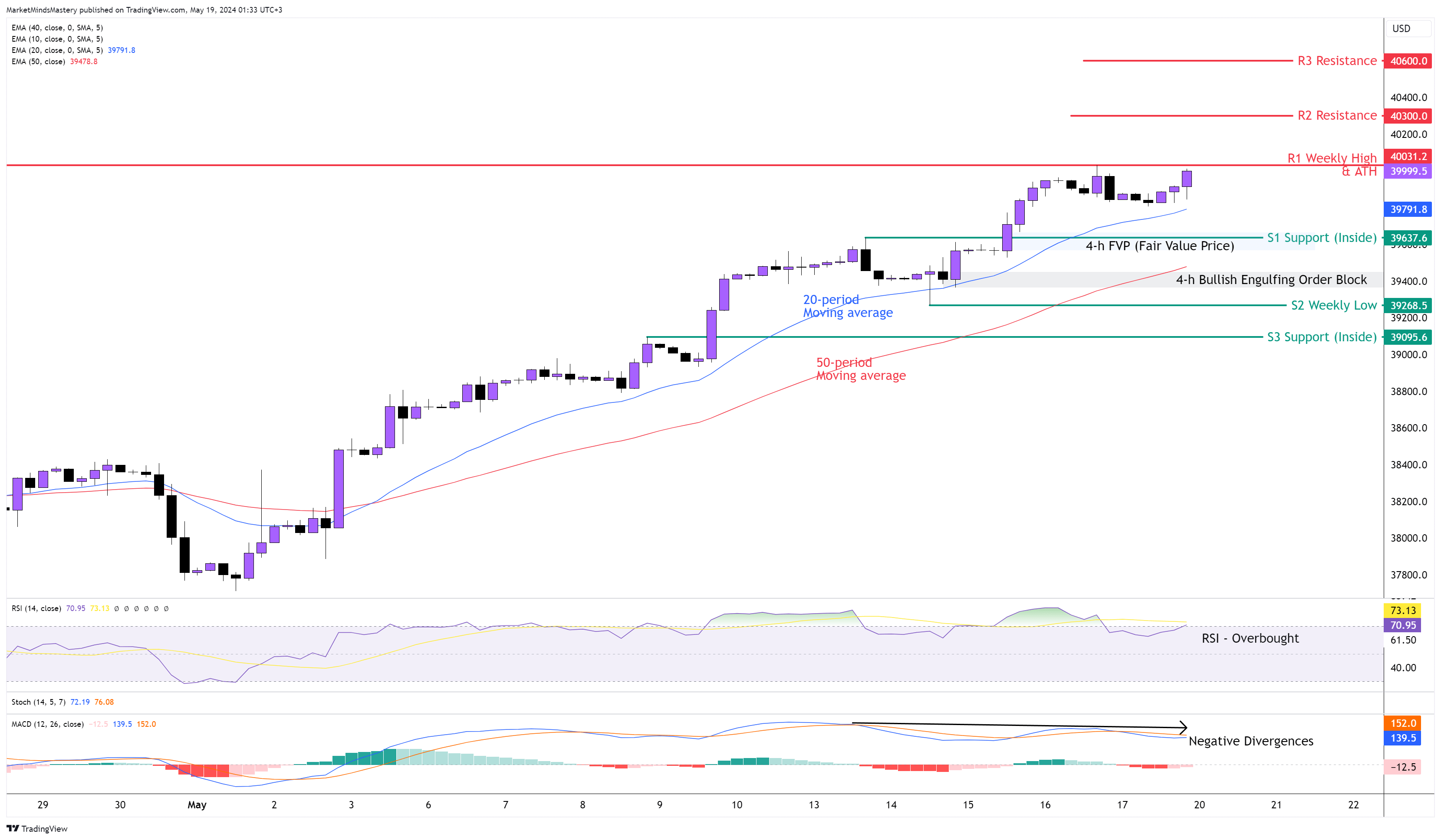 Following the uptrend of the weekly chart, last week's price continued moving upwards, successfully reaching the previous week’s high but without making a new ATH. The chart shows an equal top formation, and the MACD shows Negative Divergences. This can possibly force the price to a market correction. The RSI is overbought, indicating a strong uptrend. The 20-period moving average is above the 50-period, which has bullish implications. Starting Monday, if the price penetrates the $40000 area and closes above it, it will create an ATH. If the price keeps increasing, the resistance area R2, around $40300, will become the first potential target. A further upward move finds the next resistance area, R3, around $40600.
