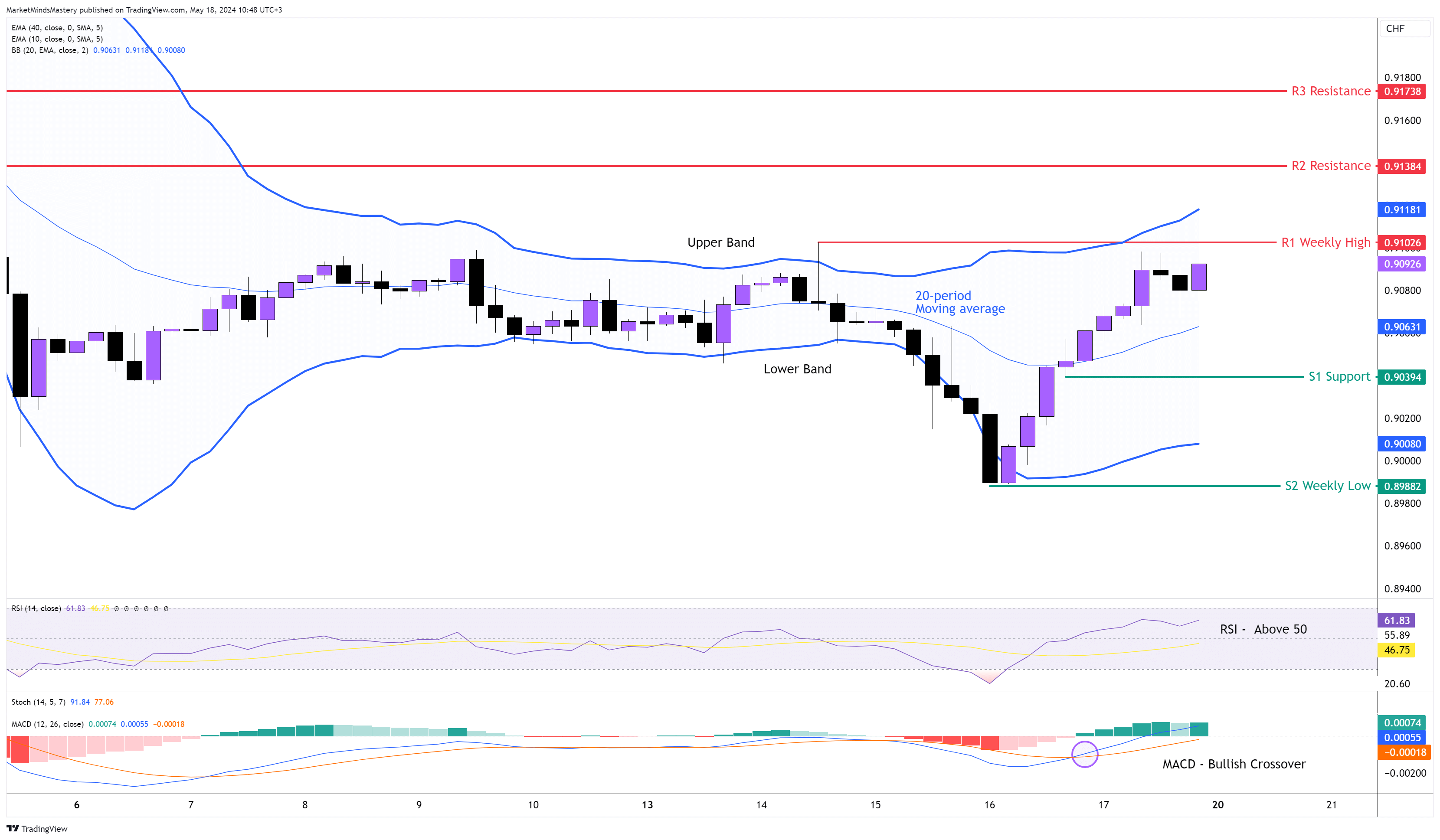 The week it was ended as a Bullish Engulfing candle with a long lower wick. It is more a combination of a Bullish Engulfing and a Hammer. On the 4-hour chart, the price traded until the previous week’s analysis levels, bounced off, and moved upwards, retracing almost 90% of the downward move. Currently, the price is trading above the middle line of the Bollinger Band, which is the 20-period moving average. The MACD created a Bullish Cross, and the RSI is above the middle line, indicating a bullish market. If the price keeps trading above the 20-period and moves upwards, the first resistance area, R1, will be the test of the previous week’s high. The level is approximately 0.9102. If the price breaks and closes above the R1 and moves away from the level, the next resistance area, R2, will be around 0.91384. On the other hand, if the price is rejected and moves downwards, the first support area, S1, is approximately 0.9039. If it penetrates the S1, closes under it, and moves downwards, the next support level is the S2, which is around 0.8988, which is the previous week’s low.
