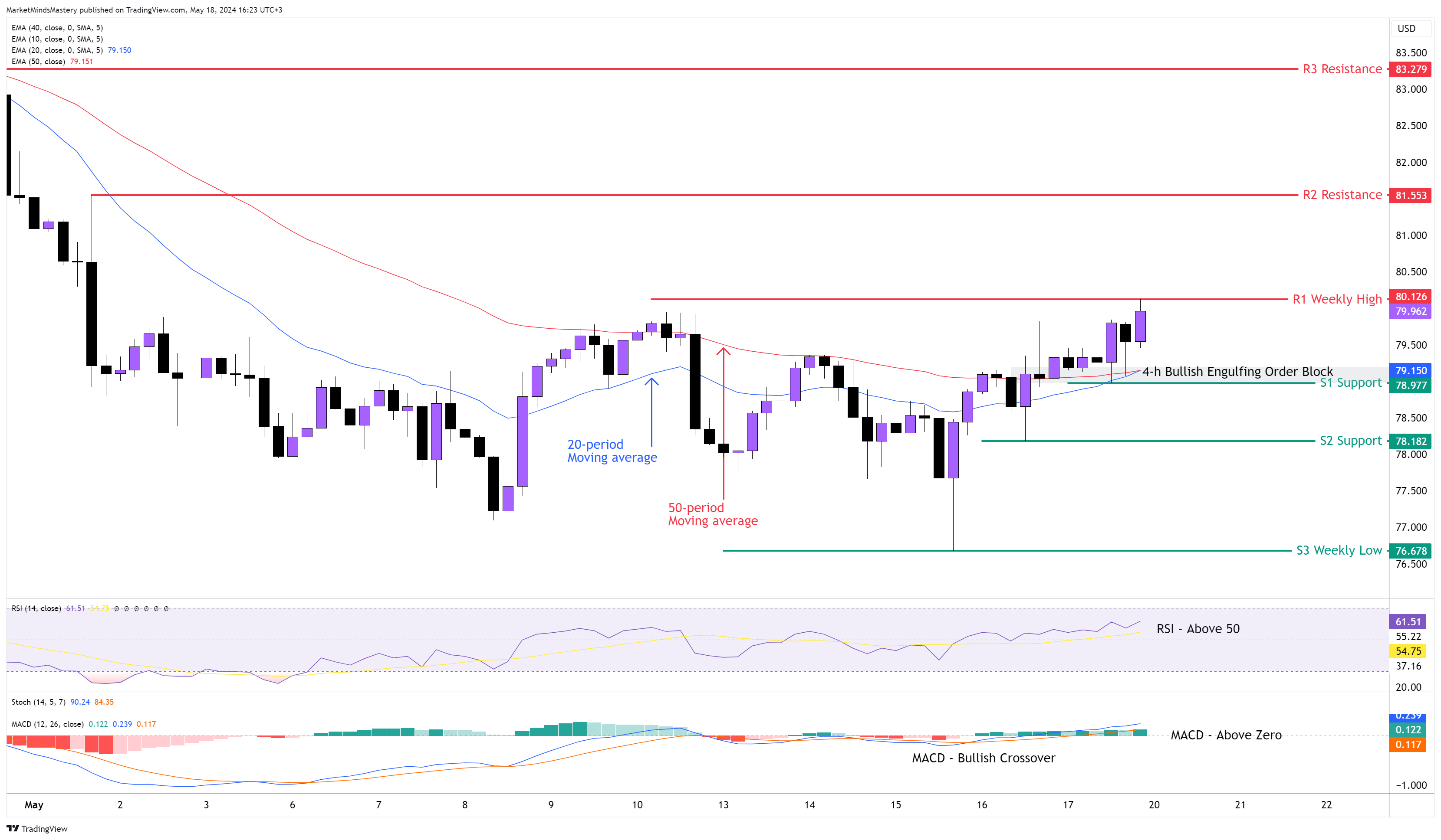Following the doji weekly candle, which occurred after a downward move, the price stopped and reversed as expected, and the last week ended with a weekly Bullish Engulfing reversal. This is one of the strongest reversal patterns because it shows the shift in the price momentum and the significance of the buy orders accumulation compared to the executed sell orders. On the 4-hour chart, the price is still in a consolidation phase and using Wyckoff analysis, it looks like the accumulation phase is forming. The 20-period is touching with the 50-period moving average as the price has yet to start trending. The MACD created a bullish crossover, trading above the zero line, indicating a bullish market. The RSI is above 50, which has a bullish bias. Starting Monday, if the price moves upwards, the first resistance, R1, will be the previous week’s high, around $80.12. If it will be an upside breakout, and the price penetrates the R1 closes above it, and moves upwards, the next resistance, R2, will be $81.55. On the other hand, if the price declines and moves downwards, the first support area, S1, will be around $79. The significance of this level is the consistency of the static support and the Bullish Engulfing Order Block. It is not unusual for the price to find support and bounce off during an uptrend development. If the price closes under the S1 and moves downwards, the next support area, S2, will be $78.18.