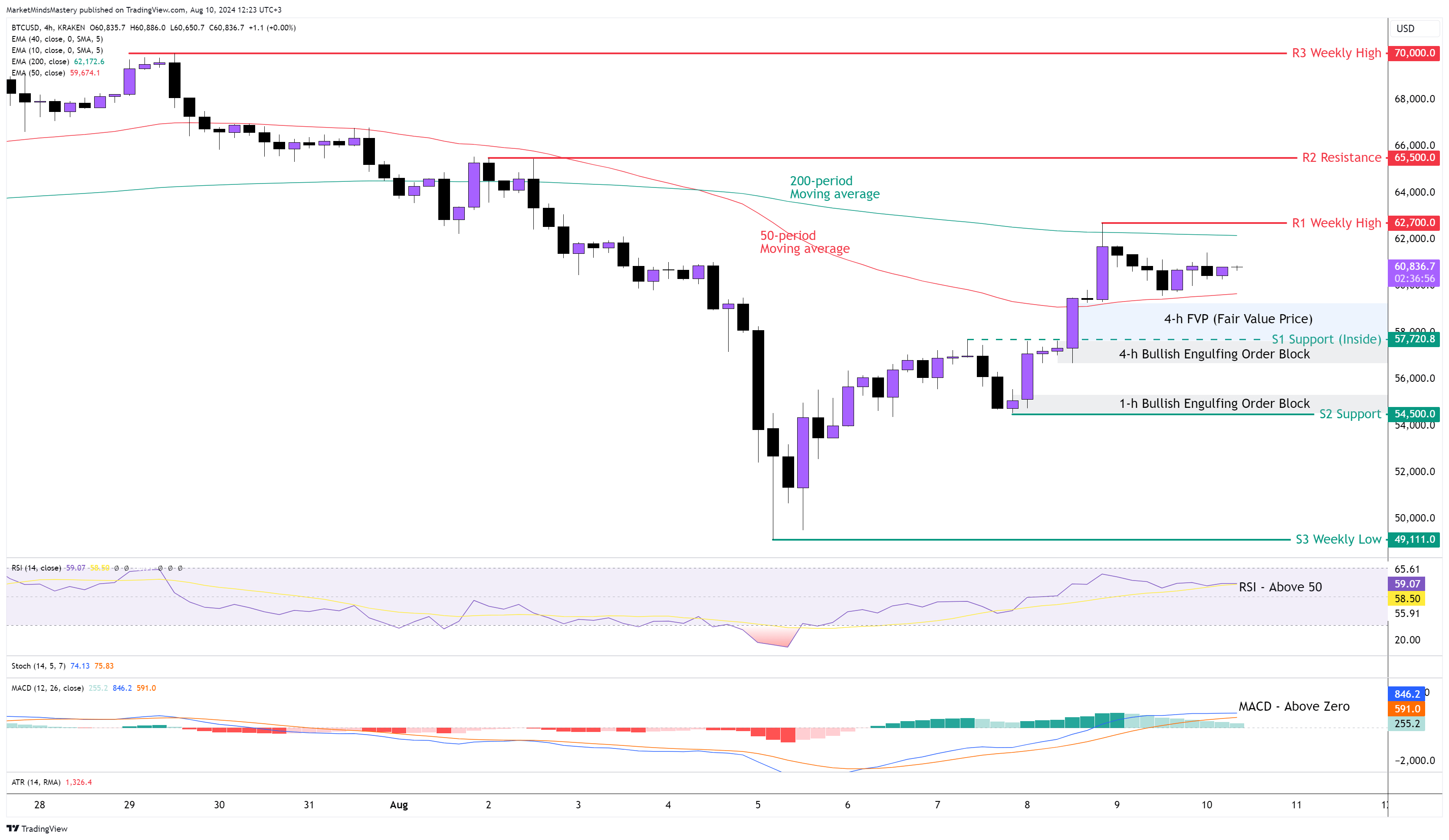 4 saatlik grafikte, fiyatın 200 dönemlik hareketli ortalamada dirençli olduğu görüldü ve fiyat şu anda 50 dönem ile 200 dönem arasında. Bununla birlikte, 50 periyot 200 periyodun altındadır ve bunun aşağı yönlü etkileri vardır. RSI 50'nin üzerindedir ve bu yükseliş göstergesidir. MACD ve Histogramının her ikisi de sıfır çizgisinin üzerindedir ve bunun yükseliş etkileri vardır. RSI ve MACD yukarıda bahsettiğimiz iki hareketli ortalamadan çok daha az periyot hesapladığından, bu kısa vadede fiyat hareketinin satış emirlerinden daha fazla alım emrine yol açtığını gösterir. Dolayısıyla, fiyat yukarı doğru hareket etmeye devam eder ve 200 dönemlik hareketli ortalamayı aşarsa, ilk direnç R1 bir önceki haftanın en yüksek seviyesi olan 62700 $ civarında olacaktır. Fiyat R1'i aşar ve yükselmeye devam ederse, bir sonraki direnç alanı olan R2 65500$ civarında olacaktır. Daha da yukarı doğru bir hareket, bir sonraki direnç olan R3'ü 70000 $ civarında bulacaktır. Fiyatın reddedilmesi ve aşağı doğru hareket etmesi durumunda, ilk destek alanı olan S1, 5720 $ civarında bir İç destek olacaktır. Bu, FVP ve Bullish Engulfing Order Block arasındadır. Fiyat S1'e nüfuz eder ve düşmeye devam ederse, bir sonraki destek alanı olan S2 54500 $ civarında olacak ve bir sonraki destek alanı olan S3, önceki haftanın en düşük seviyesi olan 49111 $ civarında olacak.