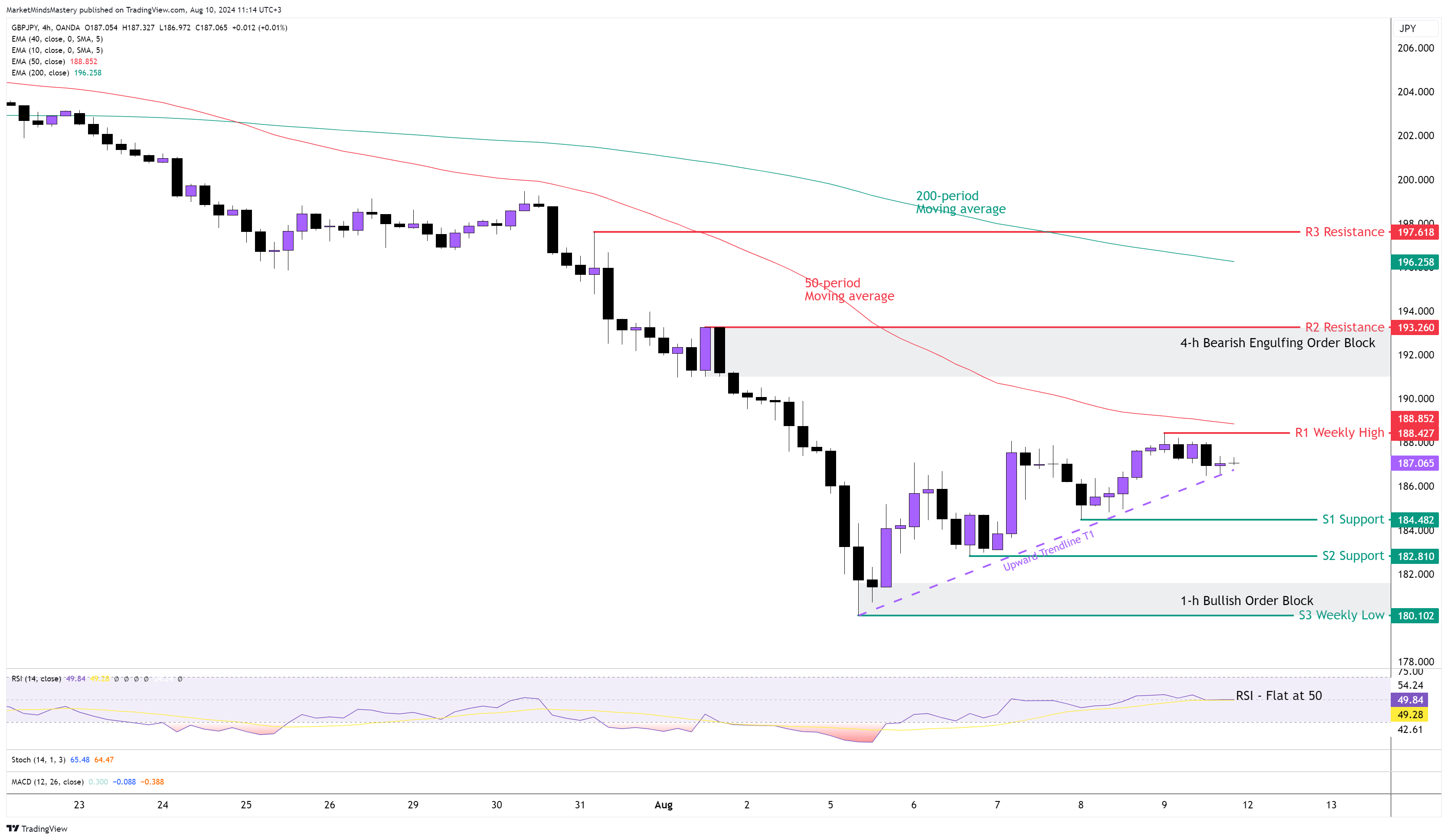 Sterlin'in geçen haftaki zayıflığına ve GBPJPY döviz çiftindeki genel düşüş trendine rağmen, haftalık grafik, yükseliş Pin Bar olarak da bilinen uzun bir alt fitil mumu olarak sona erdi. Bu, daha düşük zaman dilimlerinde potansiyel ticaret fırsatları arayan tüccarları yönlü önyargı ile bilgilendirmek için yeterince iyidir, ancak daha düşük zaman dilimlerinde piyasa yapısı ile desteklenmesi gerekir. 4 saatlik grafikte, 50 periyot 200 periyotun altında ve bu düşüş eğilimi gösteriyor. RSI Osilatörü 50 civarındadır ve kısa vadeli bir fiyat dengesine veya piyasa dengesine işaret eder. Ayın başında 192 civarında 4 saatlik bir Ayı Yutan Emir Bloğu oluşturuldu. Geçen hafta, 181 civarında, saatlik grafikte bir Bullish Order Block oluşturuldu.