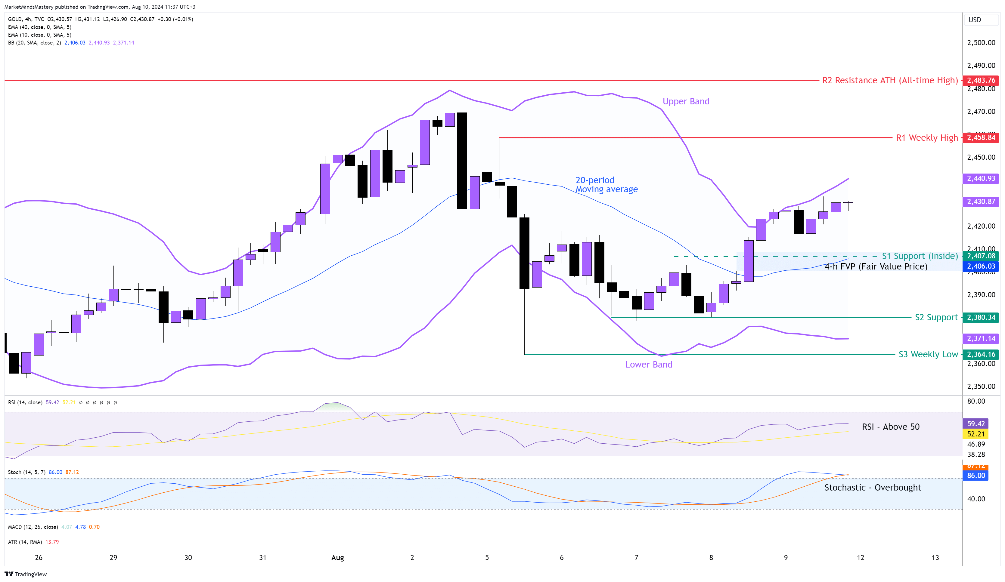 Altın piyasası bir önceki hafta küresel belirsizlik nedeniyle yatay hareket ediyordu. Temmuz ayında bir ATH (Tüm Zamanların En Yüksek Seviyesi) kaydetmesine ve birkaç hafta önce de neredeyse aynı ATH'de işlem görmesine rağmen. Teknik fiyat grafiklerine göre bir düşüş ve geri çekilme bekleniyordu. Zaman içinde Altın, yatırımcıların korku ve endişelerine iyi hizmet eden ve güvenli liman varlığı olarak kullanılan sert bir emtia haline geldi. Bollinger Bantlarını kullanarak, Altın fiyatları Üst Bant civarında ve bir yükseliş göstergesi olarak kabul edilebilir. Alt Bant hafifçe aşağıya doğru işaret ediyor ve yukarı yönlü hareketin en azından kısa vadede sürdürülebileceğini gösteriyor. Fiyat, yükseliş etkileri olan Bollinger Bantlarının ortası olan 20 dönemlik hareketli ortalamanın üzerinde işlem görüyor. Geçtiğimiz Perşembe günü, önemli bir fiyat seviyesi olan 2400 $ civarında bir FVP (Adil Değer Fiyatı) oluşturuldu. RSI Osilatörü orta çizgisi olan 50'nin üzerinde ve bu yükseliş anlamına geliyor. Stochastic Osilatör aşırı alım durumunda ve bunun da yükseliş etkileri var. Pazartesi gününden itibaren fiyat yukarı yönlü hareketini sürdürüyor ve ilk direnç alanı olan R1, bir önceki haftanın en yüksek seviyesi olan 2458 $ civarında olacak. Fiyat R1'i aşar ve yükselmeye devam ederse, bir sonraki direnç olan R2, yaklaşık 2483 $ olan ATH olacaktır. Tersine, fiyat düşer ve aşağı doğru hareket ederse, ilk destek alanı olan S1, 2407 $ civarında bir İç destek olacaktır. Fiyat S1'e nüfuz etmek yerine S1'den sıçramazsa ve daha da düşerse, bir sonraki destek alanı olan S2 2380 $ civarında olacaktır. Daha fazla düşüş, fiyatı bir önceki haftanın en düşük seviyesi olan 2364 $ civarında bir sonraki destek alanı olan S3'e kadar düşürebilir.