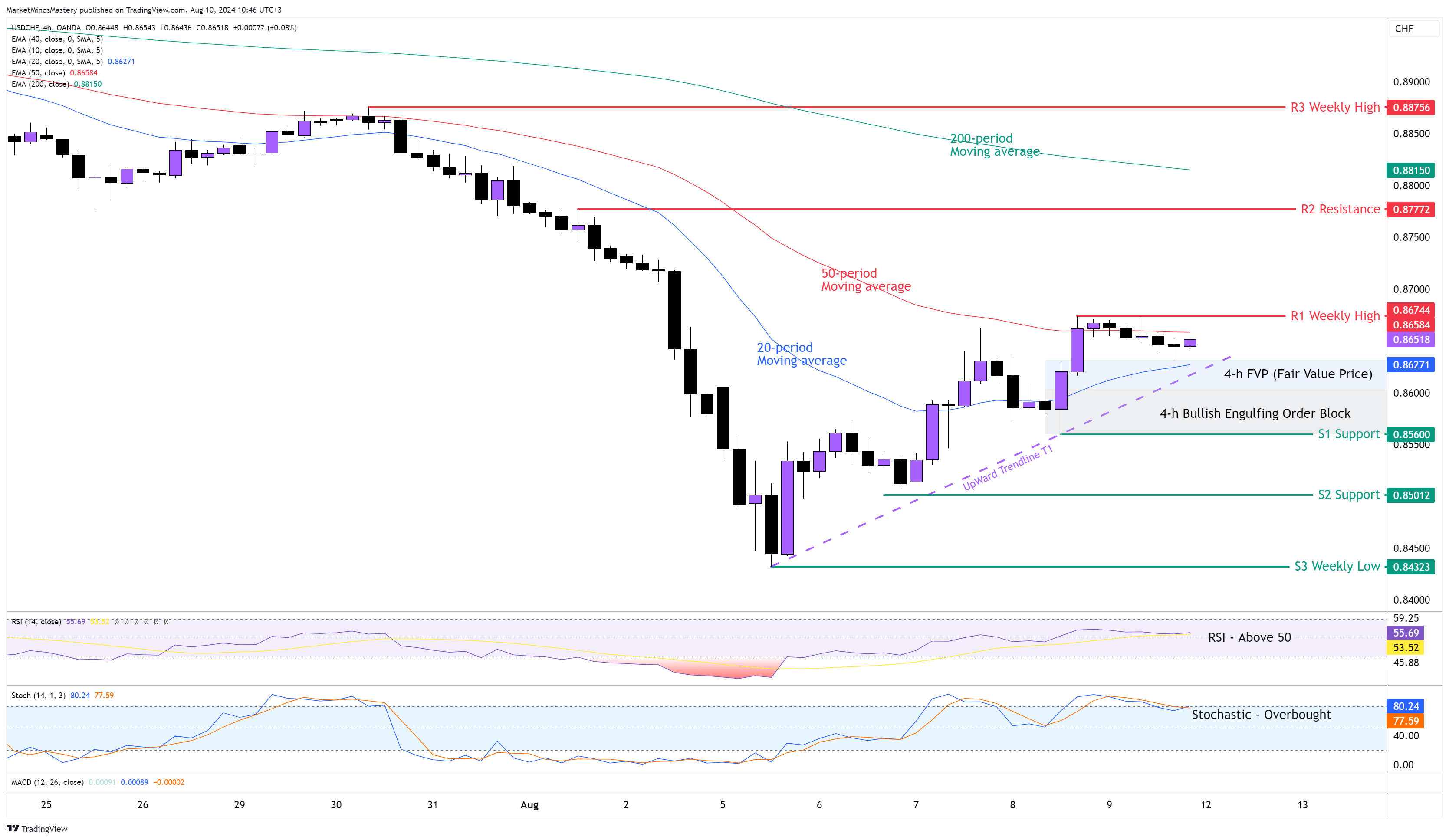 Bir önceki haftanın Piyasa Görünümünün ardından, fiyat geçen Pazartesi günü düşmeye devam etti ve ardından işlem haftasının sonuna kadar süren yukarı yönlü bir hareket başlattı. Haftalık grafikte, fiyat hareketi bir Uzun Alt Fitildir ve genellikle yükseliş etkileri vardır. 4 saatlik grafiğe bakıldığında, 20 dönemlik hareketli ortalama, 50 dönemlik hareketli ortalamanın altında ve bu bir düşüş göstergesi. Salınım Analizine göre, fiyat bir yüksek yüksek ve yüksek düşük oluşum yaptı ve bu da bir yükseliş trendine işaret ediyor. Bir T1 Yukarı Trend Çizgisi yukarıdaki grafikte yönü göstermektedir. Geçtiğimiz Perşembe günü, grafikte gösterildiği gibi 0,86000 civarında bir Bullish Engulfing Order Block ve bir FVP (Fair Value Price) oluşturuldu. RSI 50'nin üzerinde yükselişe işaret ediyor. Stochastic Osilatör, aynı zamanda bir yükseliş göstergesi olan Aşırı Alım durumundadır. Bu nedenle, fiyat daha yüksek yüksekler ve daha yüksek düşükler serisini korur ve T1 trend çizgisinin üzerinde hareket etmeye devam ederse, ilk direnç R1 yaklaşık 0,8674'tür. Fiyat R1'e nüfuz eder ve yukarı doğru hareket etmeye devam ederse, bir sonraki direnç alanı olan R2 0,87772 civarında olacaktır.