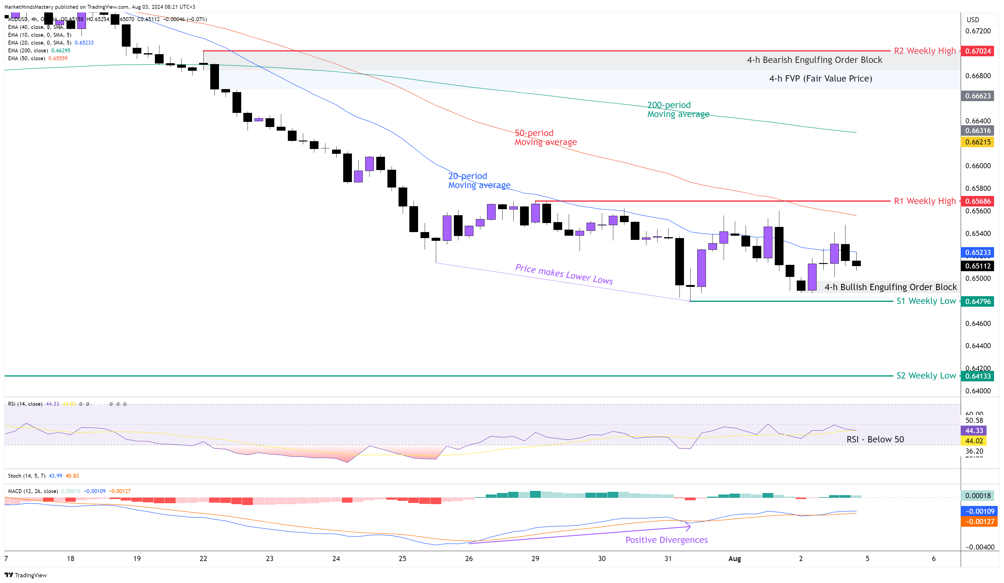 Geçen haftaki Piyasa Görünümünün ardından, AUDUSD fiyatı öncelikle Avustralya'daki negatif TÜFE (Tüketici Fiyat Endeksi) nedeniyle düşmeye devam etti. ABD Doları Cuma günü NFP sonucu nedeniyle zayıflamış olsa da, Aussie fiyatı yükseltmenin bir yolunu bulamadı. 4 saatlik grafikte, fiyat bir düşük düşük formasyon yarattı, ancak Pozitif Sapma basan MACD'nin anlaşmazlığı altında, bunun yükseliş etkileri var. Daha sonra fiyat, yukarı ya da aşağı yönlü herhangi bir kırılma hareketi olmaksızın konsolidasyonu sürdürdü ve bu, potansiyel piyasa birikiminin bir işaretidir. 20 periyot, 50 periyotluk hareketli ortalamanın altındadır. 200 dönemlik hareketli ortalama hem 20 hem de 50'nin üzerindedir ve bu zayıf bir piyasayı gösterir. RSI 50'nin altında ve bu düşüş eğilimi anlamına geliyor. Pazartesi gününden itibaren, fiyat düşer ve aşağı doğru hareket ederse, ilk destek alanı olan S1, önceki haftanın en düşük seviyesi olan yaklaşık 0,64796 olacaktır. Bu seviyede, geçtiğimiz Cuma günü bir Bullish Engulfing Order Block geride bırakıldı ve bu da sonraki bir fiyat düşüşünde ek destek sağlayabilir. Fiyat S1'e nüfuz eder ve daha da düşerse, bir sonraki destek alanı olan S2, 0,64133 civarında bir haftalık düşük fiyat olacaktır.
