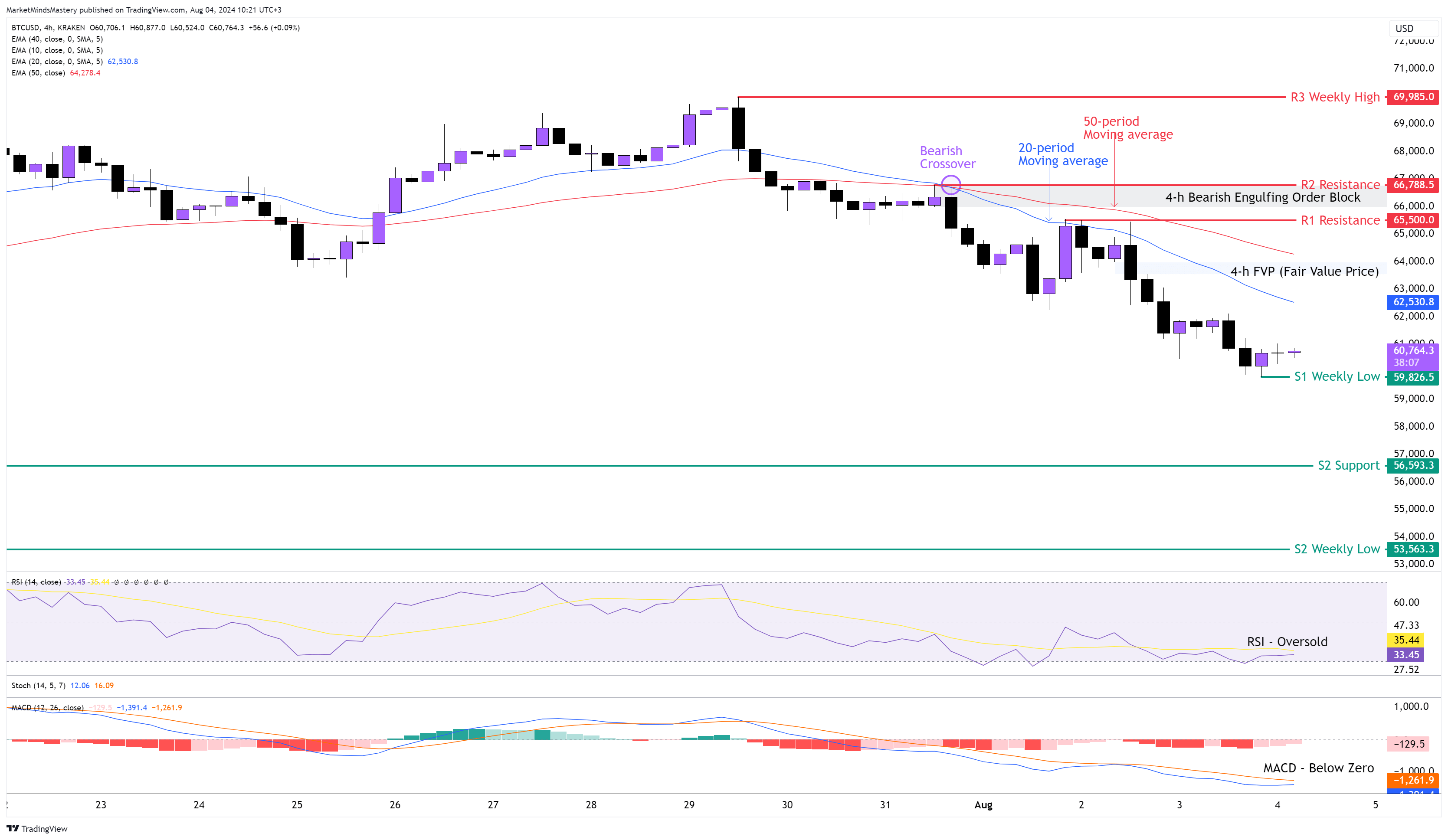 Pazartesi gününden itibaren, fiyat aşağı yönlü hareketine devam ederse, ilk destek alanı olan S1, bir önceki haftanın en düşük seviyesi olan 59826 $ civarında olacak. Fiyat S1'e nüfuz eder ve daha fazla düşerse, bir sonraki destek alanı olan S2 yaklaşık 56593 $ olacaktır.