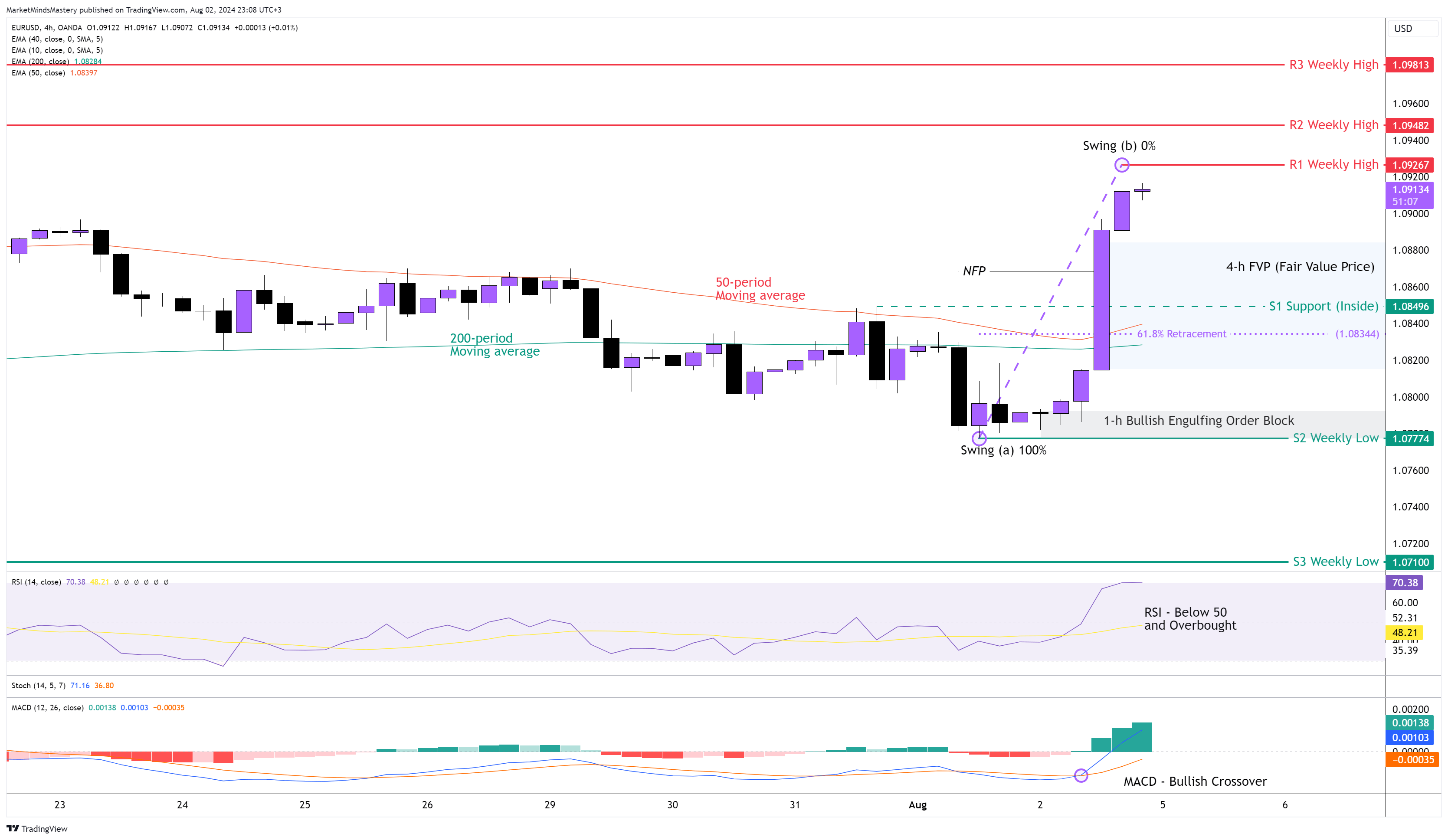 50 periyot, 200 periyotluk hareketli ortalamanın üzerindedir ve bu Boğa'dır. RSI Osilatörü yukarı yönlü hareketin gücüne işaret eden bir Aşırı Alım durumundadır. Öte yandan MACD, hem MACD Çizgisi hem de Sinyal Çizgisi sıfırın altındayken bir Boğa geçişi yarattı. MACD'nin Histogramı şimdi bir Yükseliş hareketi gösteriyor. Geçtiğimiz Cuma günü yukarı yönlü hareket sırasında fiyat bir Bullish Engulfing Order Block ve FVP (Fair Value Price) oluşturdu. Pazartesi gününden itibaren, fiyat yukarı yönlü hareketine devam ederse, ilk direnç alanı olan R1, bir önceki haftanın en yüksek seviyesi olan yaklaşık 1,09267 olacak. Fiyat R1'e nüfuz eder ve yukarı doğru hareket etmeye devam ederse, bir sonraki direnç alanı olan R2, 1.09482 civarında bir başka haftalık en yüksek seviye olacaktır. Daha yüksek zaman dilimlerinde, önemli bir tedarik bölgesi olarak kabul edilir. Yukarı doğru bir hareket, R3 direnç alanını 1.09813 civarında bulur.
