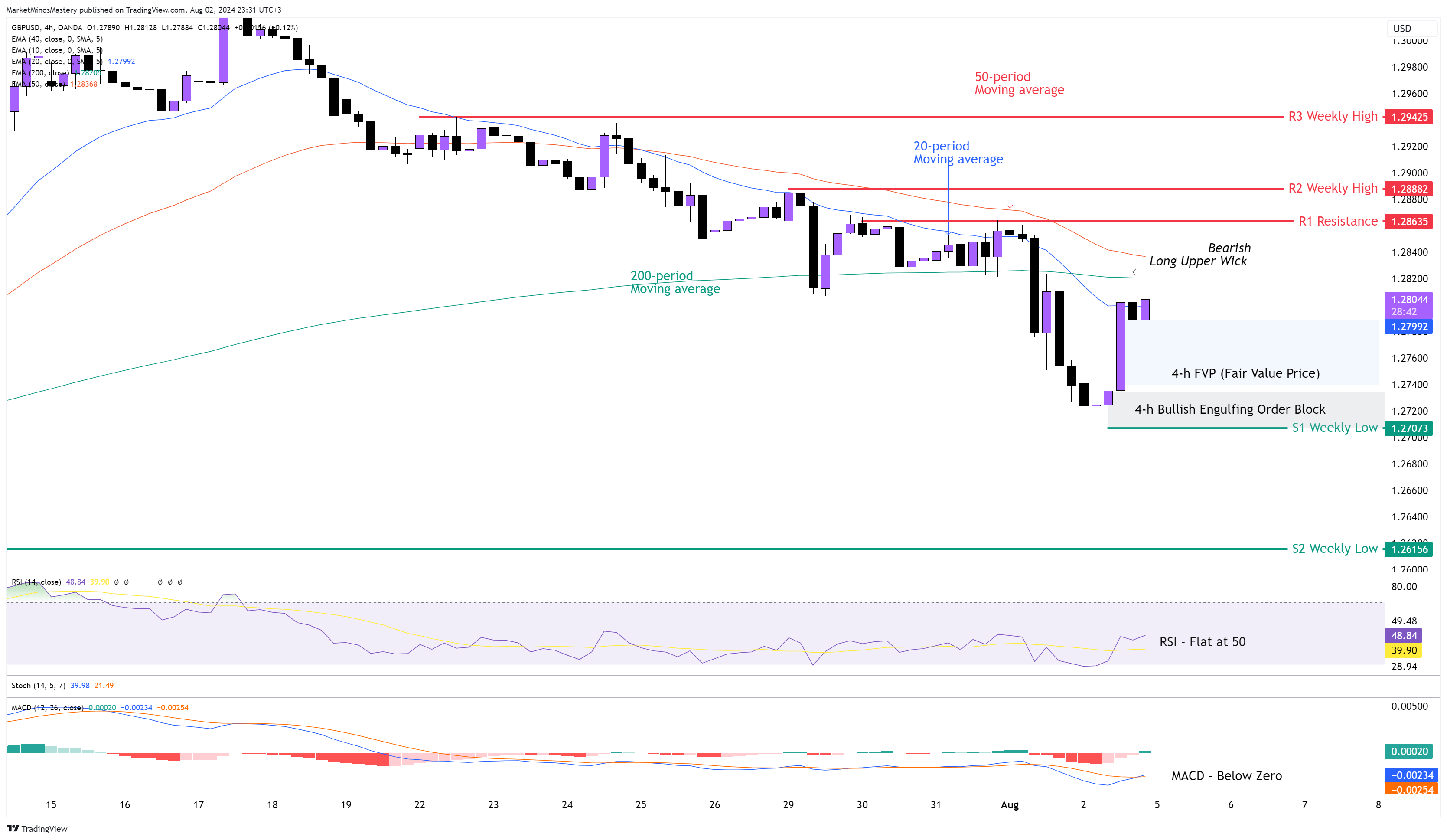 Bir önceki haftanın piyasa görünümünün ardından, fiyat yeni bir düşük-düşük formasyonu oluşturdu. Haftalık grafikte, mum bir Uzun, Ayı mumu olarak kapandı. 4 saatlik grafikte, fiyat uzun bir Ayı Marubozu mumu oluşturdu ve bu da bir FVP (Adil Değer Fiyatı) görünümüne neden oldu. Bollinger Bantlarına bakıldığında, fiyat Alt Bandın altında kapanırken, aynı zamanda Üst Bant çizgisi yukarı doğru işaret etti. Bu, kopuş güçlü bir kopuş olarak kabul edildiğinde gerçekleşir. Bollinger Bandının orta çizgisi 20 dönemlik hareketli ortalamadır ve 50 dönemlik hareketli ortalamanın altındadır ve bu düşüş olarak kabul edilir.