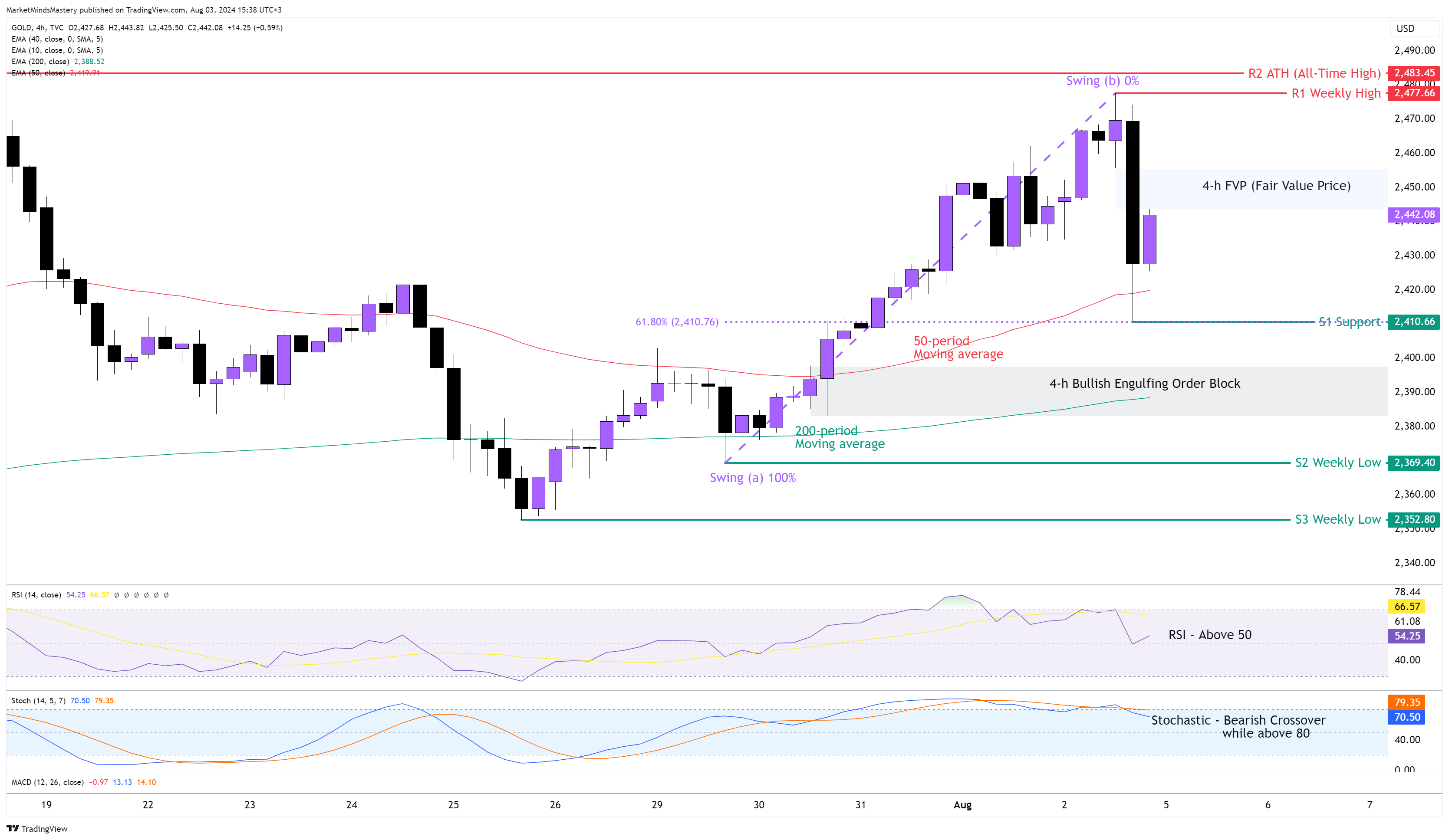 Öte yandan, fiyat aşağı doğru hareket ederse, ilk destek alanı 2410 $ olacaktır. Bu fiyat seviyesi, yukarıdaki grafikte gösterildiği gibi Fibonacci Altın Oranı %61,8 geri çekilme ile aynı seviyededir. Fiyat bu fiyat seviyesinden sıçramaz ve onu aşmazsa, düşüş bir önceki haftanın en düşük seviyesi olan S2'ye 2369 $ 'a kadar devam edebilir.