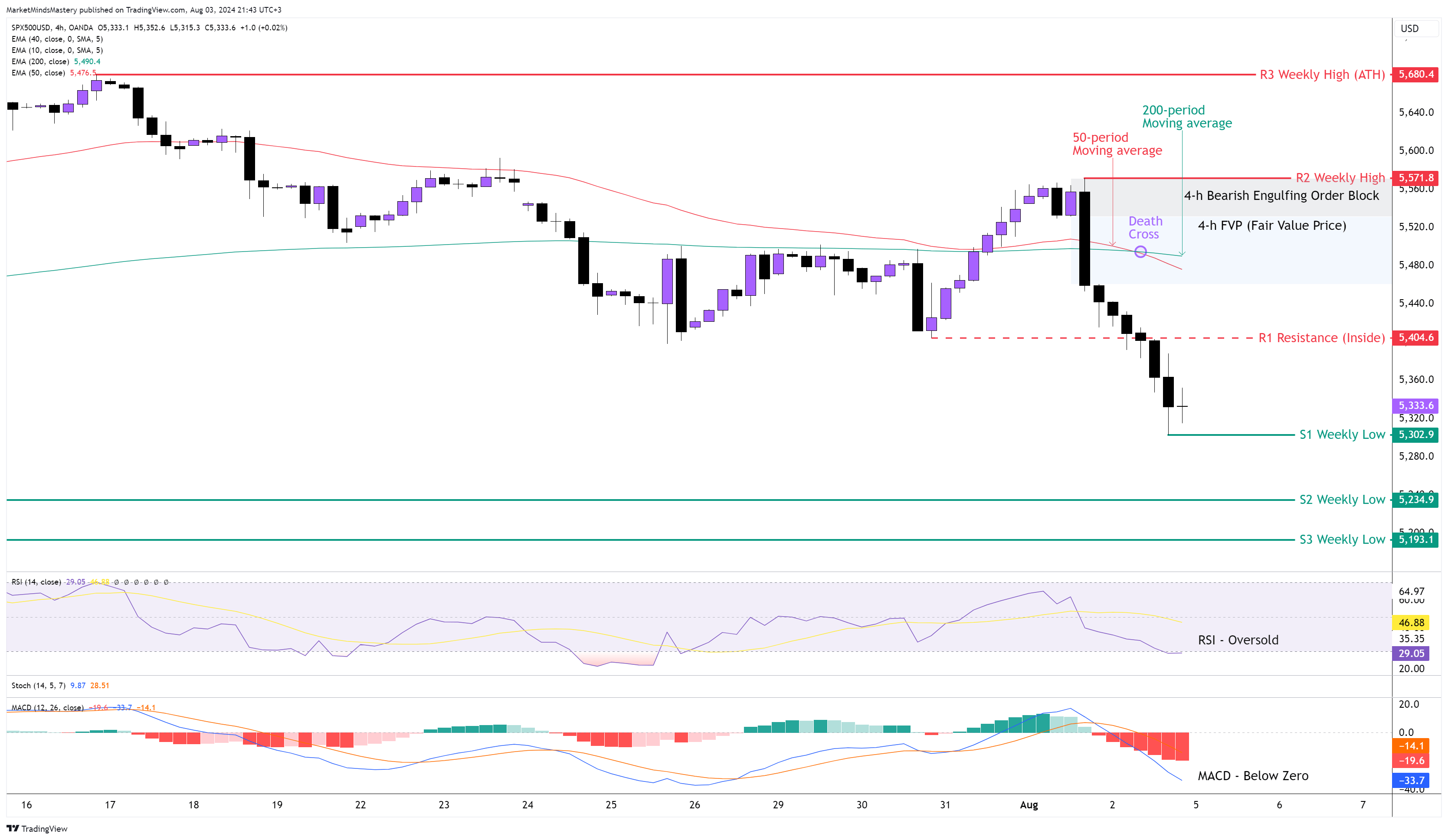 Tersine, fiyat yukarı doğru hareket ederse, ilk direnç alanı olan R1, 5404 $ civarında bir İç direnç olacaktır. Fiyatın R1'i aşması ve yukarı doğru hareket etmeye devam etmesi durumunda, bir sonraki direnç alanı olan R2, önceki haftanın en yüksek seviyesi olan 5571 $ civarında olacaktır. Grafikte gösterildiği gibi, R1 seviyesi önemli bir seviyedir çünkü bir FVP (Adil Değer Fiyatı) ve 4 saatlik bir Bearish Englulfing's Order Block oluşturulmasına neden olmuştur. Yukarı doğru bir film daha, R3 direncini ATH (Tüm Zamanların En Yüksek) olan 5680 $ 'da bulacaktır.