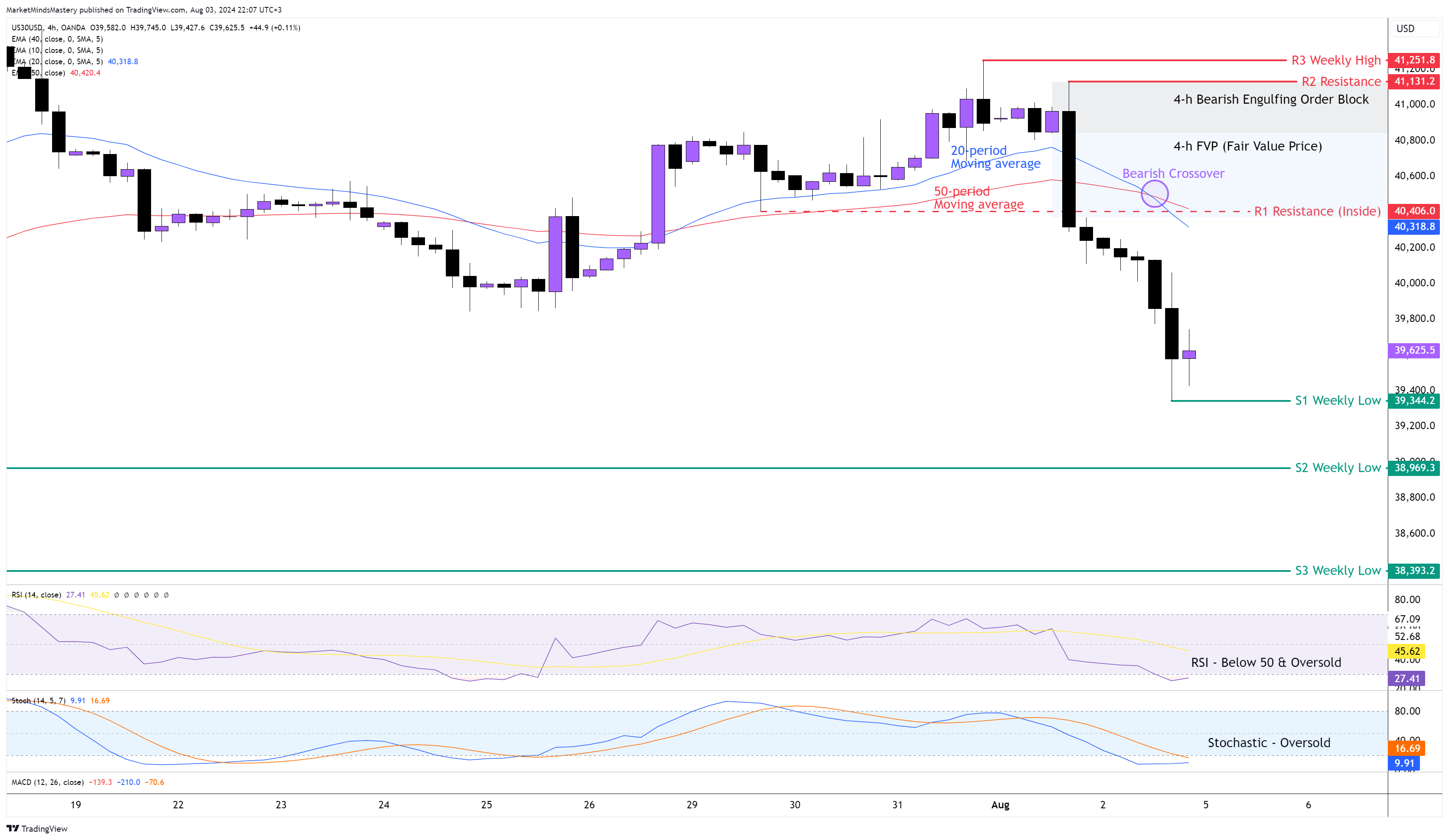 Opsiyonel olarak, fiyat bir geri çekilme veya birincil (haftalık) trendin devamı için yukarı doğru hareket ederse, ilk direnç olan R1, yaklaşık 40406 $ 'lık bir İç direnç olacaktır. Bu, 20 dönemlik hareketli ortalama ile bir arada bulunur. Fiyat artmaya devam ederse, bir sonraki direnç alanı R2, 41131 $ olacaktır. R2'ye kadar yükselmek için fiyatın FVP ve 4 saatlik Bearish Engulfing Order Block'a girmesi gerekiyor.