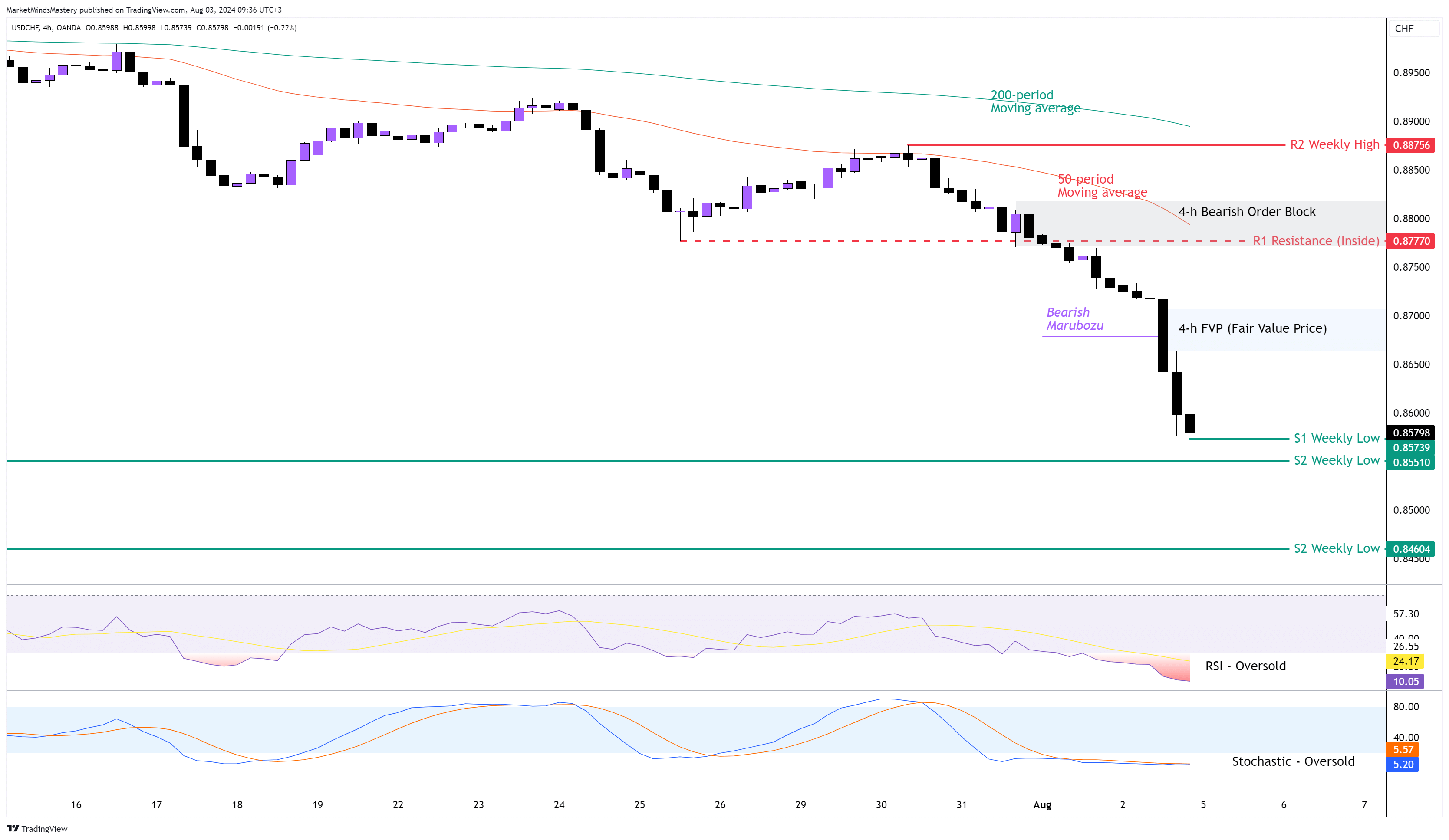 Geçen hafta İsviçre'nin değer kazanması, NFP'nin rapor edilmesinin ardından Cuma günü USDCHF'nin önemli ölçüde düşmesine neden oldu. Döviz çifti iyi tanımlanmış bir düşüş trendi içindeydi ve ABD'deki olumsuz haberler fiyat düşüşünde belirleyici faktör oldu. Salınım analizine göre, fiyat daha düşük yüksekler ve daha düşük düşükler yapıyor, ve düşüş trendi hala geçerli. 50 dönemlik hareketli ortalama, 200 dönemlik hareketli ortalamanın altında ve aralarındaki mesafe genişliyor ve fiyat yoğun işlem hacmi altında düşüyor. Ayı Marubozu mumu geçen Cuma günü NFP açıklamasında yaratıldı ve bir FVP (Adil Değer Fiyatı) yaratılmasına neden oldu. RSI ve Stochastic Osilatörlerin her ikisi de bir Aşırı Satım Durumunda ve bunun aşağı yönlü etkileri var.