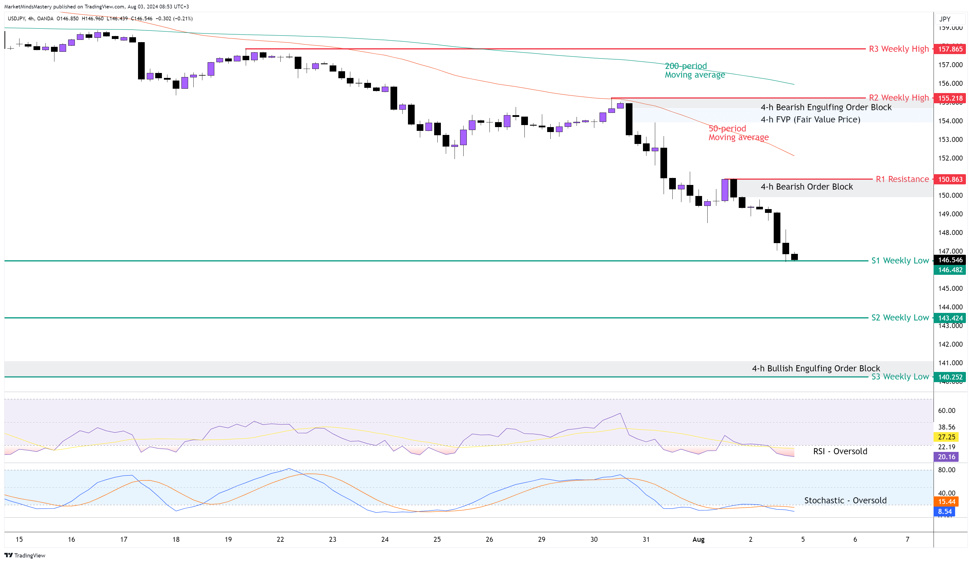 Bir önceki haftaki fiyat düşüşünün ardından, fiyat bir önceki haftaki Piyasa Görünümünde işaret ettiğimiz FVP'ye (Adil Değer Fiyatı) girdi ve ardından güçlü bir düşüş trendi altında geriledi. Mum çubuklarını 4 saatlik grafikte incelediğimizde, siyah mumların (Ayı) çok daha fazla olduğunu ve Boğa mumlarının da daha uzun bir fiyat aralığına sahip olduğunu görüyoruz. Bu, güçlü bir düşüş trendinin göstergesidir. Hafta boyunca neredeyse 900 piplik bu büyük fiyat düşüşü, ilk etapta Japonya Merkez Bankası'nın diğer tüm büyük bankaların mevduat oranlarını düşürdüğü veya değiştirmediği aynı zamanda faiz oranlarını artırmaya karar vermesiyle meydana geldi. 50 dönemlik dönem, 200 dönemlik hareketli ortalamanın altındadır ve bu düşüş eğilimindedir. RSI ve Stochastic Oscillators her ikisi de güçlü bir fiyat düşüşüne işaret eden bir Aşırı Satım durumundadır. Fiyat daha düşük yüksekler ve daha düşük düşükler yapmaya devam ediyor ve salınım analizine göre düşüş trendi hala bozulmamış durumda. Geçen Cuma, fiyat bir ters mum veya düşük bir salınım yaratmadı. Bu nedenle, şu anda potansiyel bir Fibonacci düzeltmesini ölçmek mümkün değil. Fiyat aşağı doğru hareket etmeye devam ederse, ilk destek alanı olan S1, bir önceki haftanın en düşük seviyesi olan 146,48 civarında olacaktır. Bu, bir önceki haftanın mum kapanış fiyatıyla neredeyse aynı fiyat seviyesidir. Fiyat S1'e nüfuz eder ve daha da düşerse, bir sonraki destek alanı olan S2, 143,42 civarında bir başka haftanın en düşük seviyesi olacaktır.