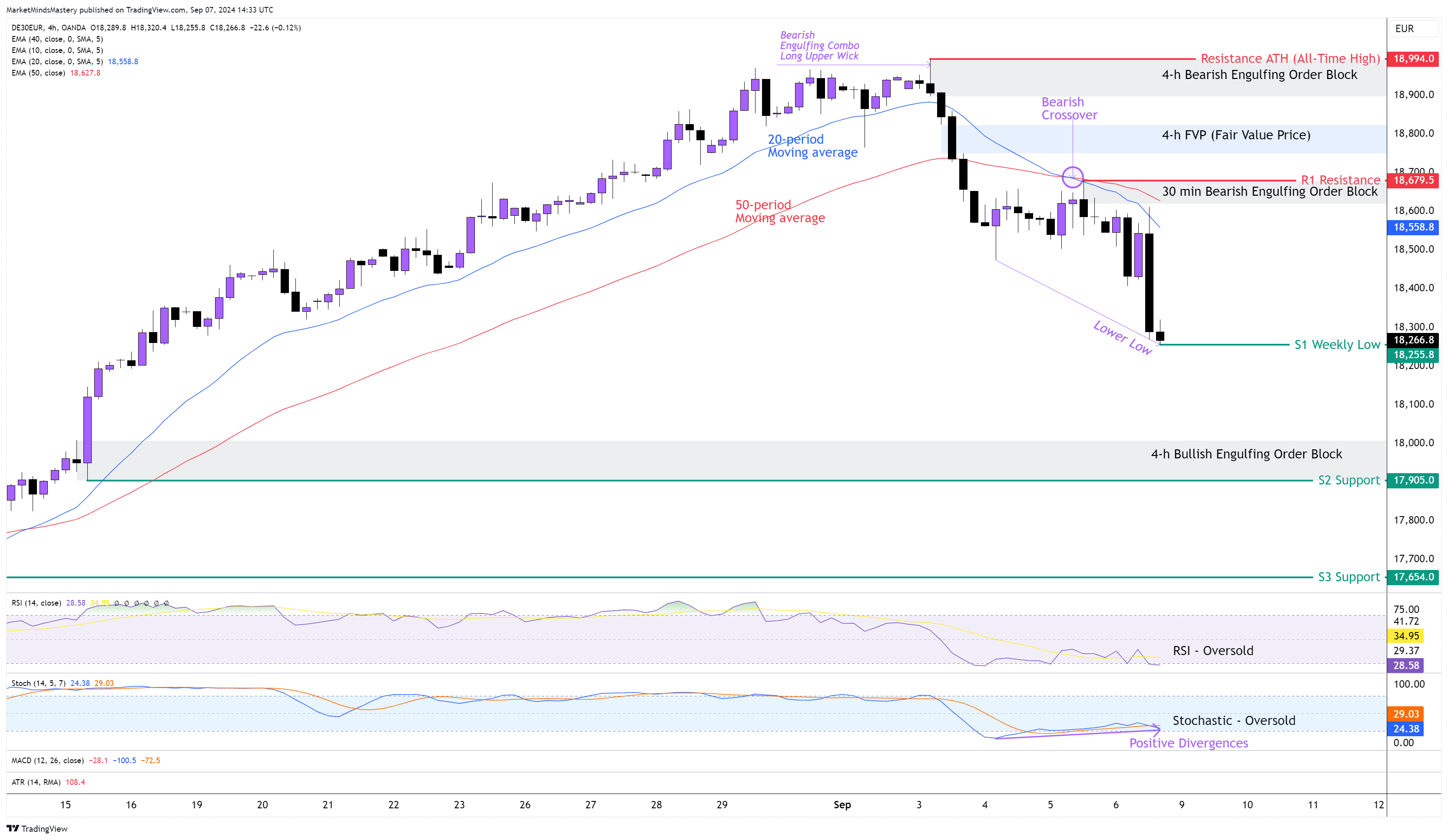 Bir önceki haftanın Piyasa Görünümünün ardından GER30'un fiyatı ATH (Tüm Zamanların En Yüksek) leviyesindeydi. Geçtiğimiz Salı günü, fiyat 19000 civarında Yeni bir ATH oluşturdu. Ancak, Uzun Üst fitilli bir Ayı mumu bir Yanlış Kırılmaya neden oldu ve fiyat hafta sonuna kadar aşağı doğru hareket etmeye başladı ve haftalık grafikte bir Yutan Ayı Ters Mum formasyonu oluşturdu. 4 saatlik grafikte ise fiyat daha düşük bir tepe ve daha düşük bir dip formasyonu oluşturdu. Geçtiğimiz Perşembe günü, 20 periyotluk hareketli ortalama 50 periyotluk hareketli ortalamanın altına indiğinde bir Ayı Çaprazlaması oluştu.