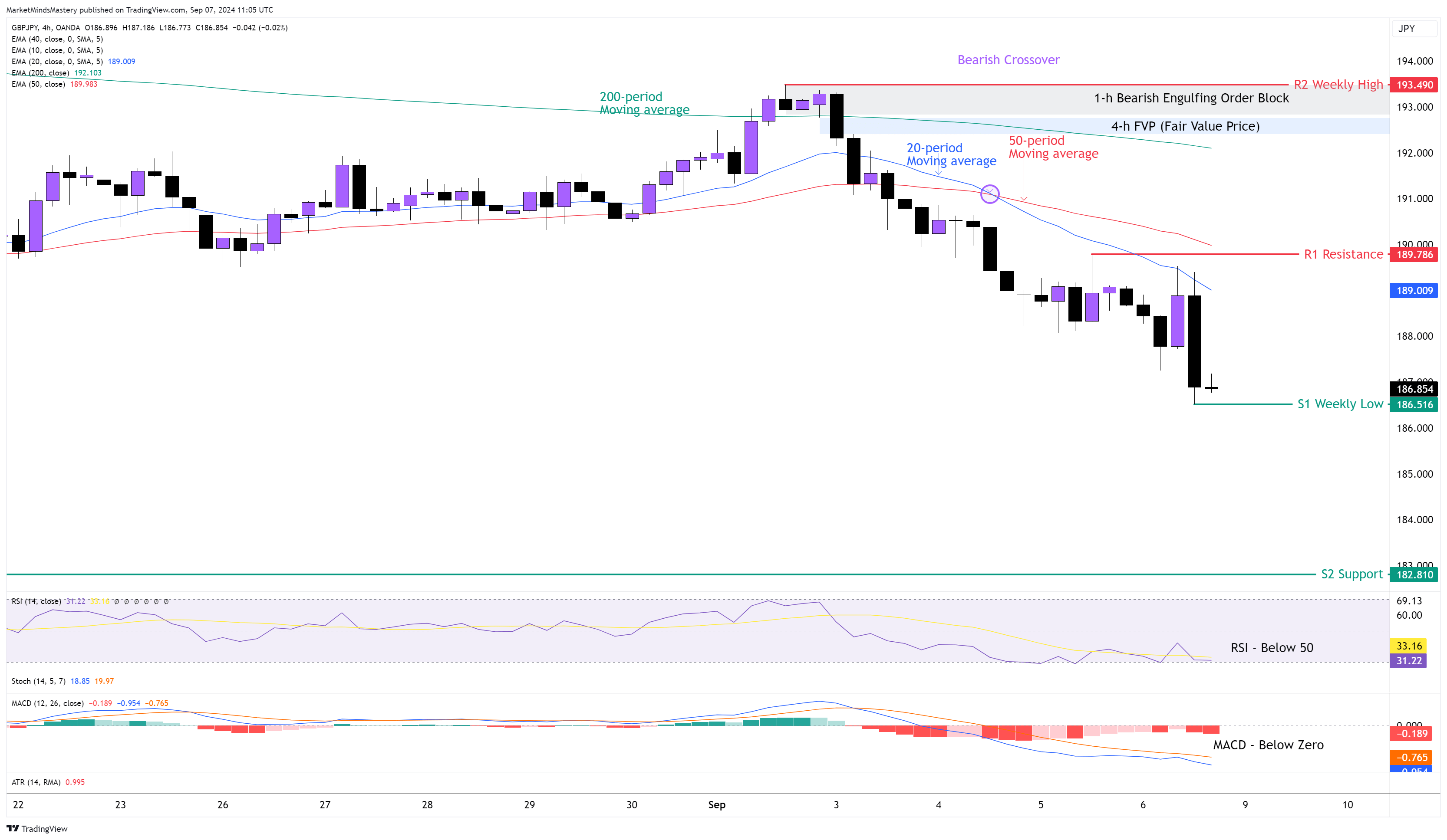 Haftalık grafikteki iç mum, bir önceki haftanın piyasa görünümünde açıklanmıştı ve fiyatın yukarı doğru hareket etmeyi bırakmasına ve aşağı yönlü bir ivmeye işaret eden haftalık piyasa yapısı nedeniyle beklendiği gibi düşmesine neden oldu. Geçen hafta, GBPJPY döviz çiftinin haftalık candle'ı, 10 ve 40 dönemlik hareketli ortalamayı (grafikte gösterilmemiştir) reddederek bir Ayı Yutan Tersine Dönüş olarak sona erdi. Geçtiğimiz Çarşamba günü 20 periyot, 50 periyotluk hareketli ortalamanın altından geçerek piyasanın bir düşüş trendi içinde olduğunu teyit etti. Düşüş trendinin başlangıcı geçtiğimiz Salı günü başladı ve fiyat 193 seviyesi civarında bir Yutan Ayı Emir Bloğu ve 192,50 civarında bir FVP (Adil Değer Fiyatı) oluşturdu. RSI Osilatörü orta çizgisi olan 50'nin altında ve bunun aşağı yönlü etkileri var. MACD sıfır çizgisinin altında ve MACD Çizgisi (Mavi) Sinyal Çizgisinin (Turuncu) altında, bu da düşüşe işaret ediyor. Fiyat daha düşük yüksekler ve daha düşük düşükler yaptıkça, düşüş trendi raptiye içinde.