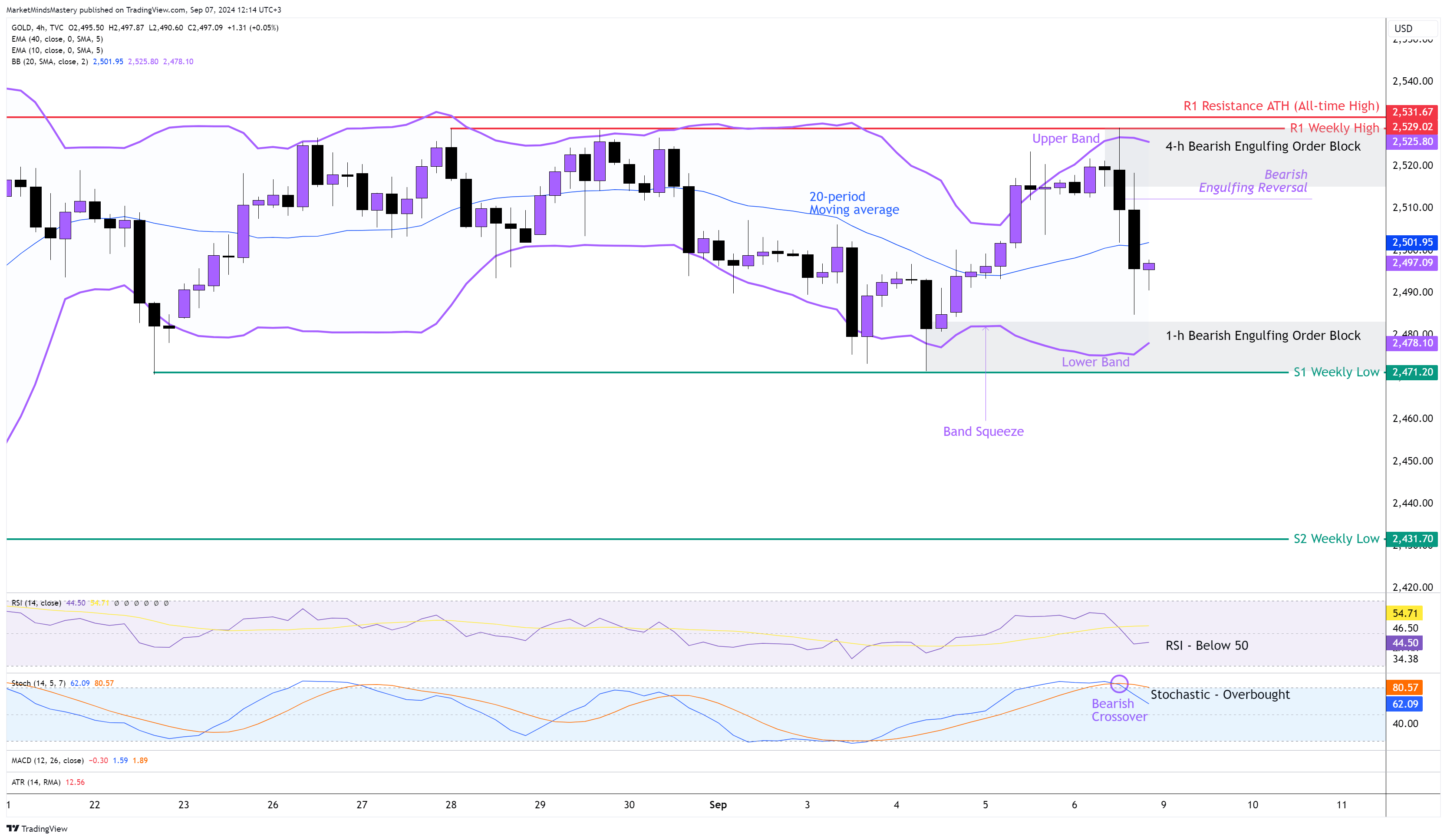 Fiyatlar bir aralıkta işlem gördüğünden, volatilitede bir artış altında güçlü bir yön kırılmasının ne zaman gerçekleştiğini belirlemek için öncelikle Üst ve Alt bantları nedeniyle Bollinger Band göstergesini kullanacağız. Şu anda fiyat, Bollinger Bandının ortasında yer alan 20 dönemlik hareketli ortalamanın altında ve bunun düşüş yönünde etkileri var. Pazartesi gününden itibaren, fiyat 20 periyodun altında kalmaya devam eder ve aşağı doğru hareket ederse, ilk destek alanı önceki haftanın en düşük seviyesi olan 2471 $ civarında olacaktır. Bu, göstergenin Alt Bandı ve 1 saatlik Bullish Engulfing Order Block ile bir arada bulunduğu için önemli bir destek seviyesi olarak kabul edilir. Fiyatın S1 desteğine girmesi ve aşağı doğru hareket etmeye devam etmesi durumunda, bir düşüş trendinin başlaması mümkün olacak ve bir sonraki destek alanı olan S2, eski bir haftalık düşük fiyat olan 2431 $ civarında olacaktır.