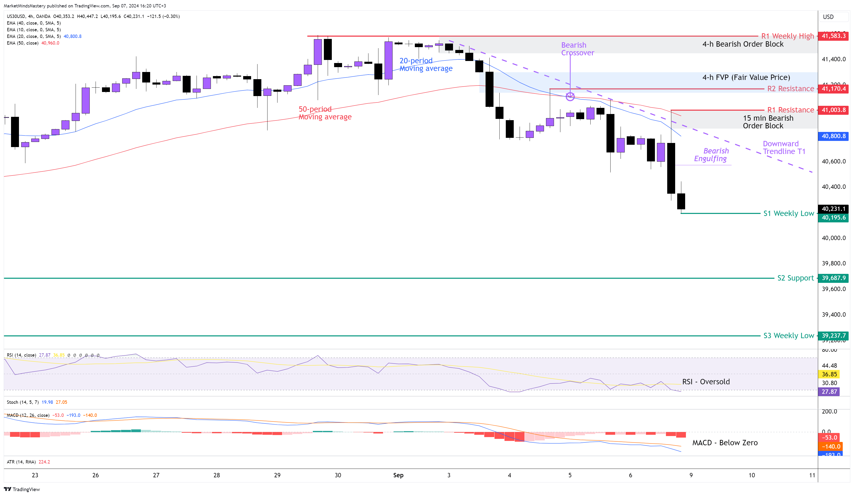 US30'daki fiyat hareketinin ardından, fiyat haftalık grafikte bir Ayı Yutan fiyat hareketi mum çubuğu oluşturdu ve piyasayı düzeltici bir aşamaya soktu. Ancak 4 saatlik grafikte bu durum trendin tersine döndüğünü gösterdi. Fiyat daha yüksek zirveler ve daha yüksek dipler yapmayı bıraktı ve bunun yerine daha düşük zirveler ve daha düşük dipler oluşmaya başladı. Geçtiğimiz Çarşamba günü 20 periyotluk hareketli ortalama 50 periyotluk hareketli ortalamanın altından geçerek bir Ayı Geçişi oluşturdu. Geçtiğimiz Cuma günü fiyat 41000$ civarında bir Yutan Ayı Sipariş Bloğu oluşturdu. Bundan önce, geçen Pazartesi, yaklaşık 41500 $ 'lık bir başka Ayı Emir Bloğu oluşturdu ve geçen Salı, yaklaşık 41200 $' lık bir FVP (Adil Değer Fiyatı) oluşturdu. RSI Osilatörü hızlı fiyat düşüşünü takip etti ve Aşırı Satım durumuna girdi. MACD sıfır çizgisinin altından geçti. Histogram ı da sıfır çizgisinin altında ve bu da düşüş eğilimini gösteriyor. Şu anda fiyat Aşağı Trend Çizgisi T1'in altında. Aşağı doğru hareket etmeye devam ederse, ilk destek alanı olan S1, bir önceki haftanın en düşük seviyesi olan 40195 $ civarında olacak. Fiyat S1'e nüfuz eder ve düşmeye devam ederse, bir sonraki destek alanı olan S2, 39687 $ civarında olacaktır. Fiyatın S2'den geçmesi ve düşmeye devam etmesi durumunda, bir sonraki destek alanı olan S3, 39237 $ civarında eski bir haftanın en düşük seviyesi olacaktır. Tersine, fiyat sıçrar ve yukarı doğru hareket etmeye başlarsa, ilk direnç alanı olan R1, Bearish Engulfing mumunun 41000 $ civarında yüksek noktası olacaktır. Fiyat R1'i aşar ve yukarı doğru hareket etmeye devam ederse, bir sonraki direnç alanı olan R2 41170 $ olacak ve bir sonraki direnç olan R3, önceki haftanın en yüksek seviyesi olan 41583 $ olacaktır.