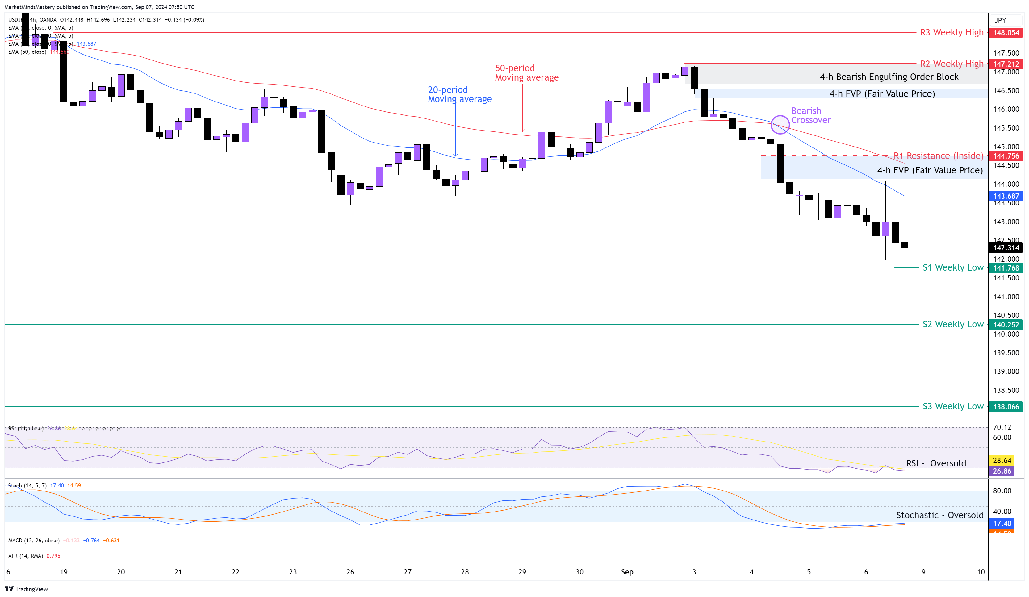 Osilatörleri kullanarak Momentum analizi ile ilgili olarak, RSI Aşırı satım durumundadır, ve Stochastic aynı zamanda Aşırı Satım durumundadır, ancak %K Çizgisi (Mavi) %D Çizgisi'nin (Turuncu) üzerine çıktığı için Bullish Crossover ile birlikte Osilatör 20 çizgisinin altındadır. Birincil (haftalık) ve 4 saatlik grafik arasındaki anlaşmaya göre fiyatın aşağı doğru hareket etmeye devam ettiğini varsayarsak, ilk destek alanı olan S1 141,76 civarında olacaktır. Bu, bir önceki haftanın en düşük fiyatıdır. Fiyatın S1'den geçmesi ve düşmeye devam etmesi durumunda, bir sonraki destek alanı olan S2, 140,25 civarında daha eski bir haftalık düşük fiyat olacaktır. Aşağı doğru bir hareket, bir sonraki destek seviyesini yaklaşık 138,06'da bulacaktır.